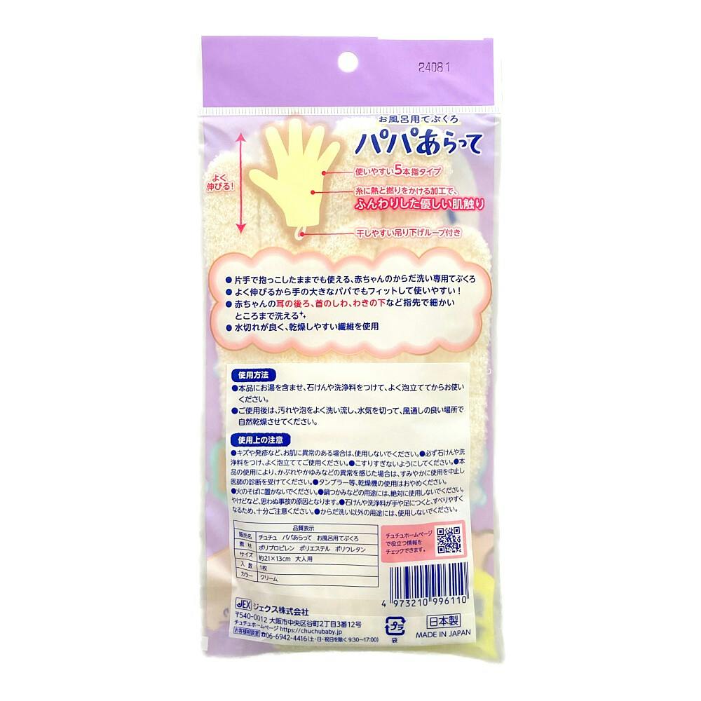 ●片手で抱っこしたままでも使える、赤ちゃんのからだ洗い専用てぶくろ ●よく伸びるから手の大きなパパでもフィットして使いやすい! ●赤ちゃんの耳の後ろ、首のしわ、わきの下など指先で細かいところまで洗える ●水切れが良く、乾燥しやすい繊維を使用