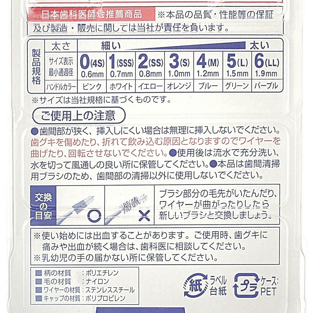 使用上の注意/●歯間部が狭く挿入しにくい場合は無理に挿入しないでください●歯グキを傷めたり折れて飲み込む原因となりますのでワイヤーを曲げたり回転させないでください●使用後は流水で充分洗い水を切って風通しの良い所に保管してください。等