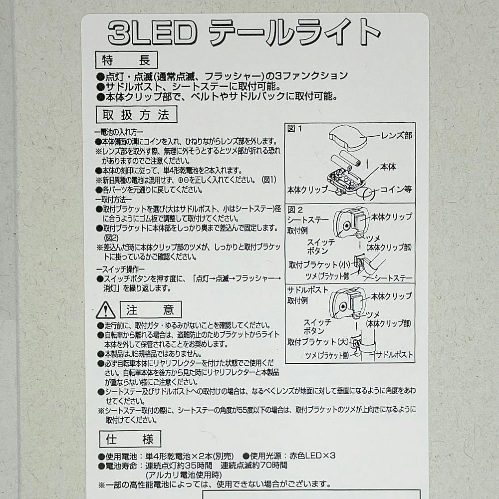 ●ポケットやカバンに取付け出来るクリップ付き。●3種類の機能付テールライト●点灯・点滅(通常点滅、フラッシャー)の3ファンクション●サドルポスト、シートステーに取付可能。●本体クリップ部で、ベルトやサドルバックに取付可能。
