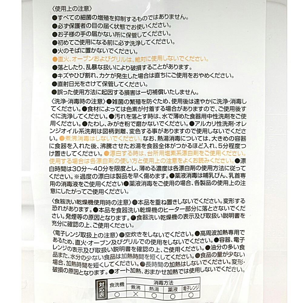 ●すべての細菌の増殖を抑制するものではありません。●必ず保護者の目の届く状態でお使いください。●お子様の手の届かない所に保管してください。●初めてご使用になる前に必ず洗浄してください。●火のそばに置かないでください。など