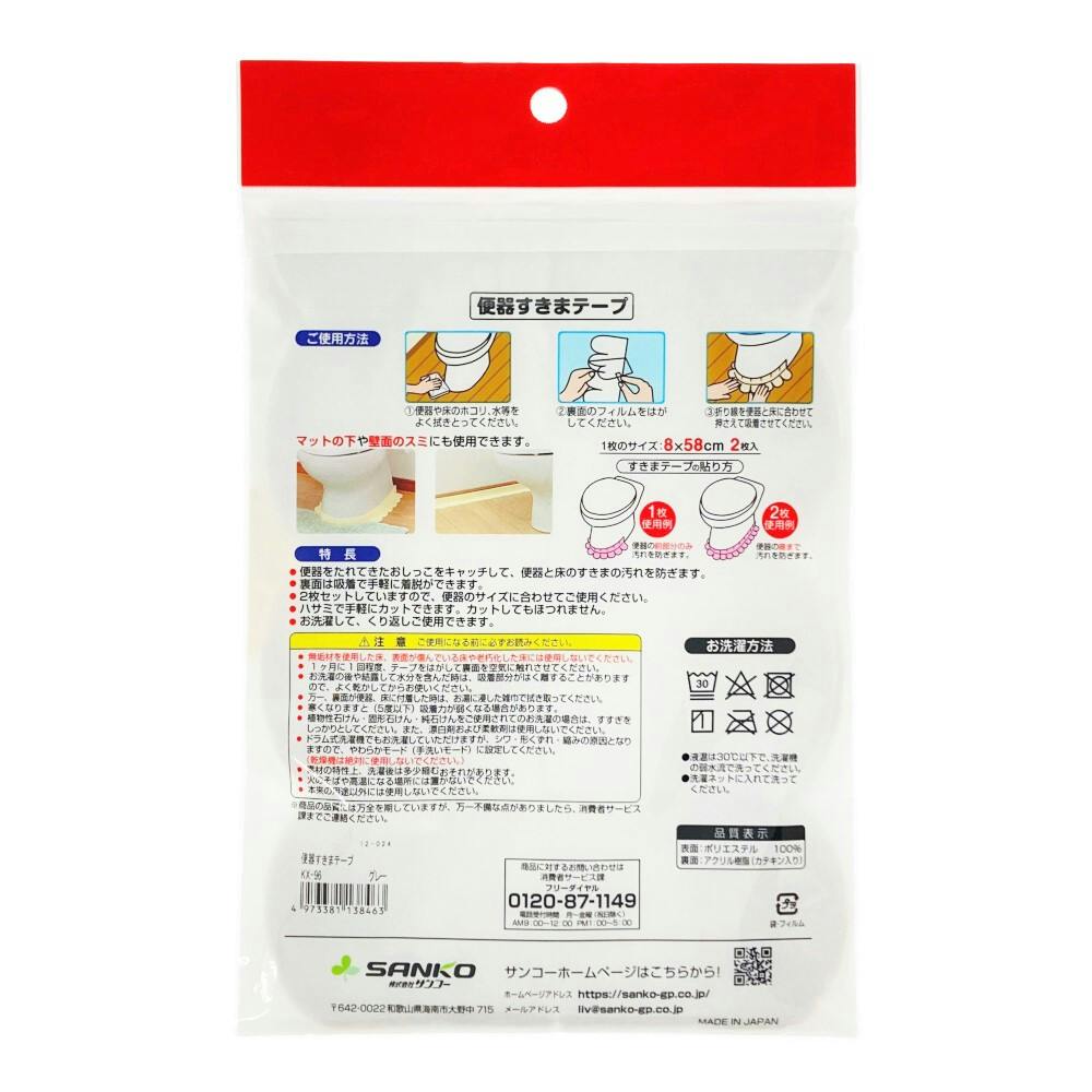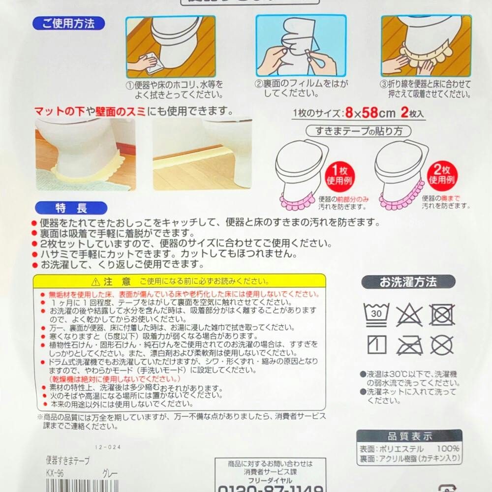 ●無垢材を使用した床、表面が傷んでいる床や老朽化した床には使用しないでください。●1ヶ月に1回程度、テープをはがして裏面を空気に触れさせてください。●万一、裏面が便器、床に付着した時は、お湯に浸した雑巾で拭き取ってください。など