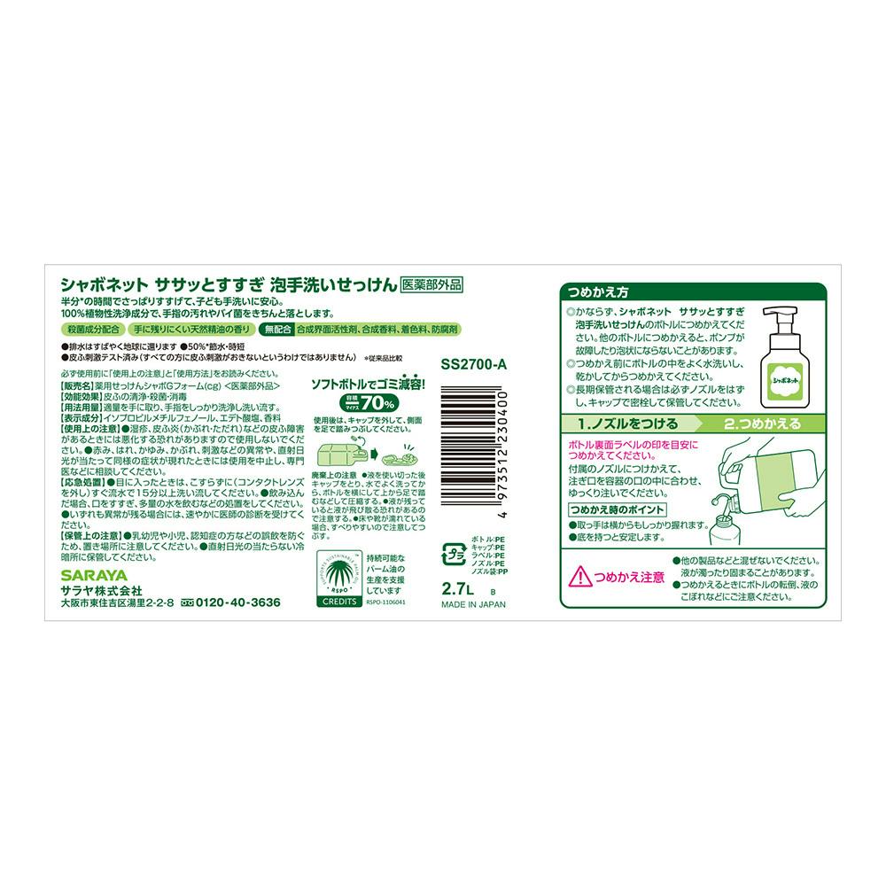 サラヤ シャボネットササッとすすぎ 泡手洗いせっけん 詰替 2.7L