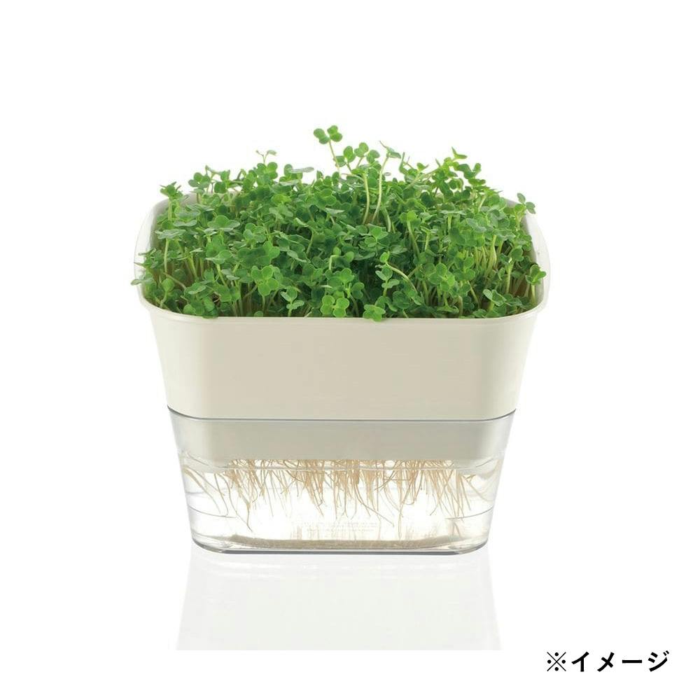 育て方/1.下容器に水を入れて、種を1晩つけておきます。2.上容器にあけて種を均等にならします。3.下容器の目安線まで水を入れセットします。4.アルミホイルなどで容器を覆い暗所にします。5.芽の高さが上容器の縁くらいになったら、光をあてます。等