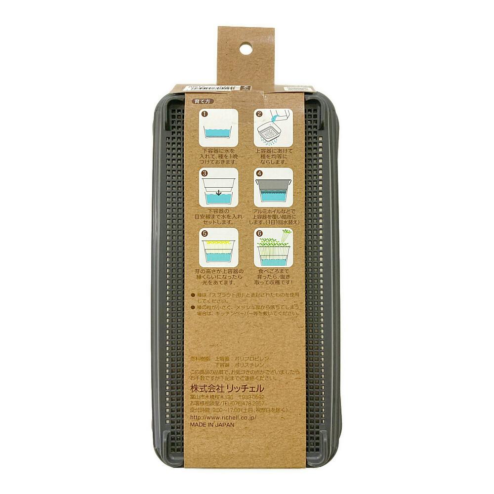 育て方/1.下容器に水を入れて、種を1晩つけておきます。2.上容器にあけて種を均等にならします。3.下容器の目安線まで水を入れセットします。4.アルミホイルなどで容器を覆い暗所にします。5.芽の高さが上容器の縁くらいになったら、光をあてます。等