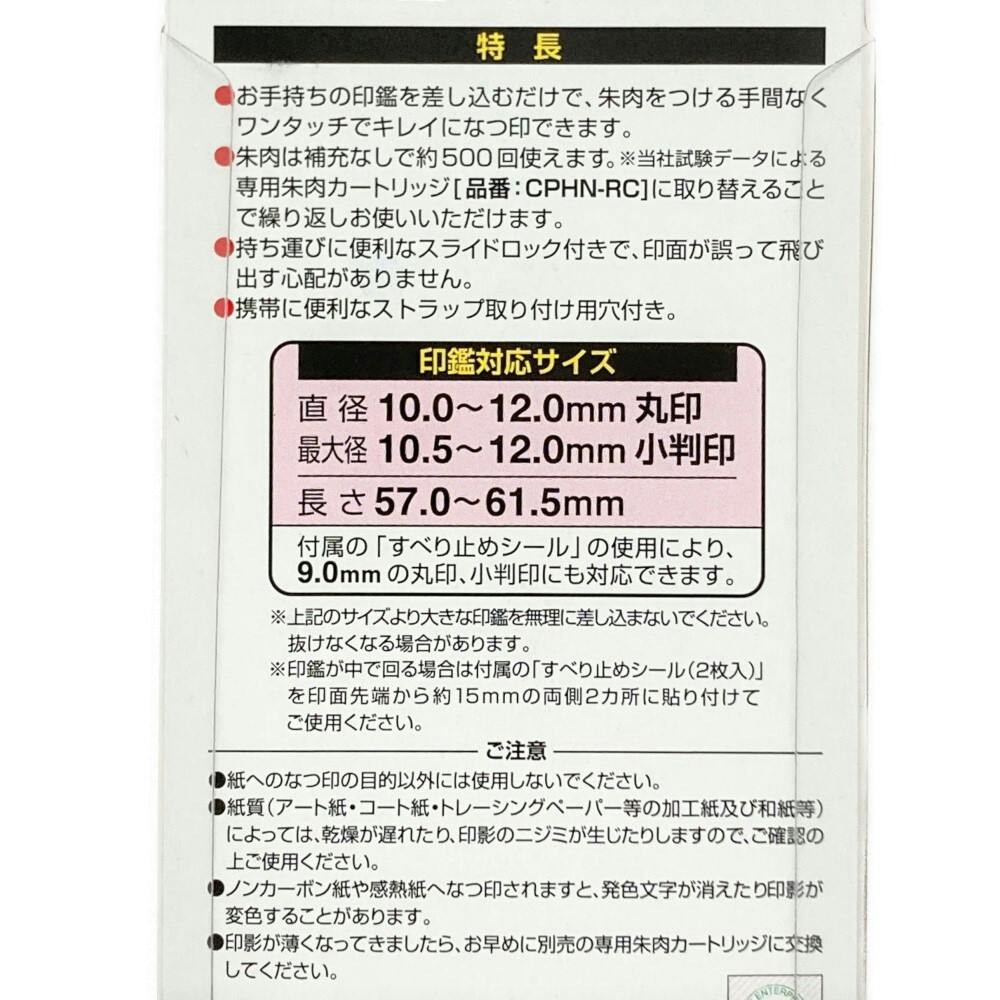 ●お手持ちの印鑑を差し込むだけで、朱肉をつける手間なくワンタッチでキレイになつ印できます。●朱肉は補充なしで約500回使えます。●持ち運びに便利なスライドロック付きで、印面が誤って飛び出す心配がありません。●携帯に便利なストラップ取り付け用穴付き。