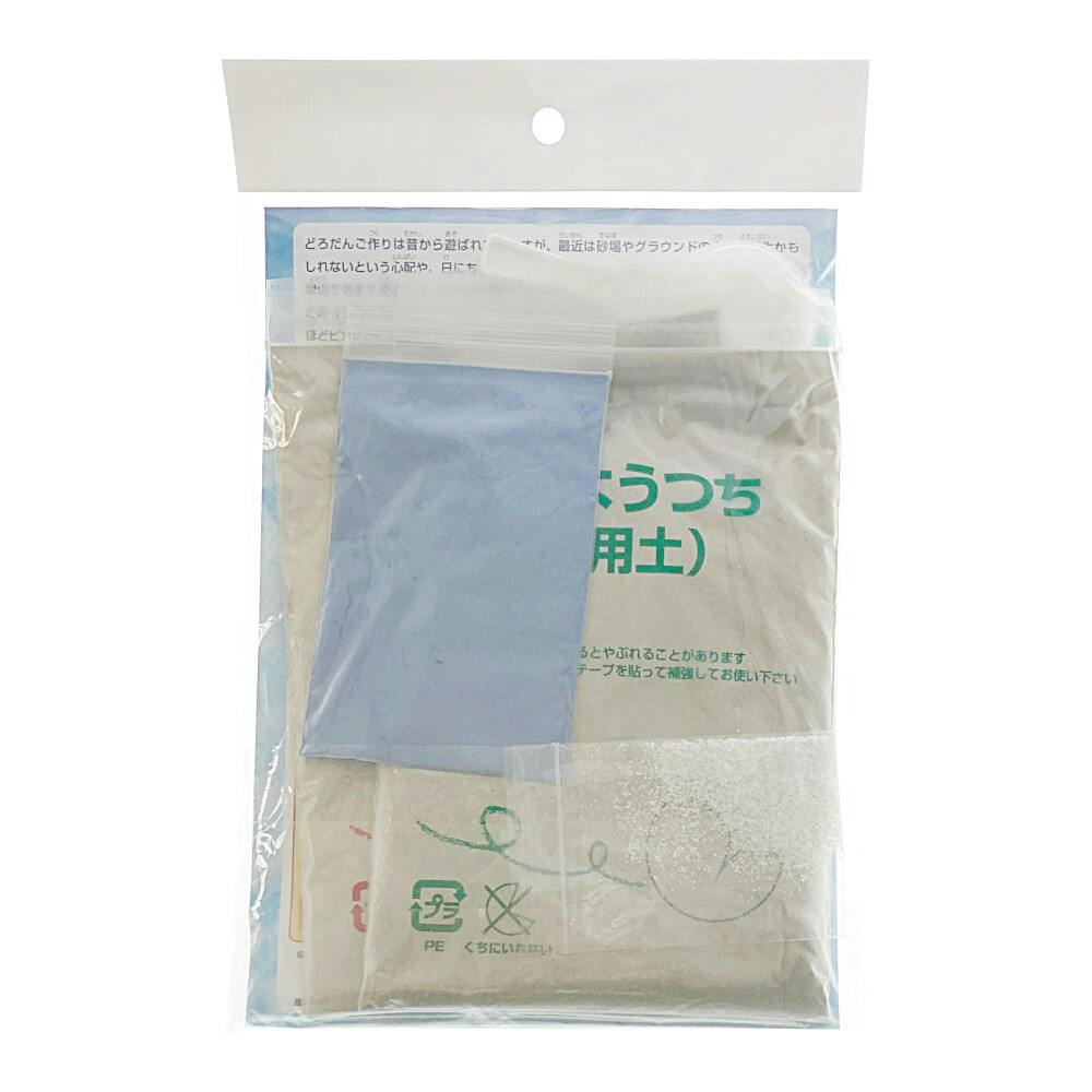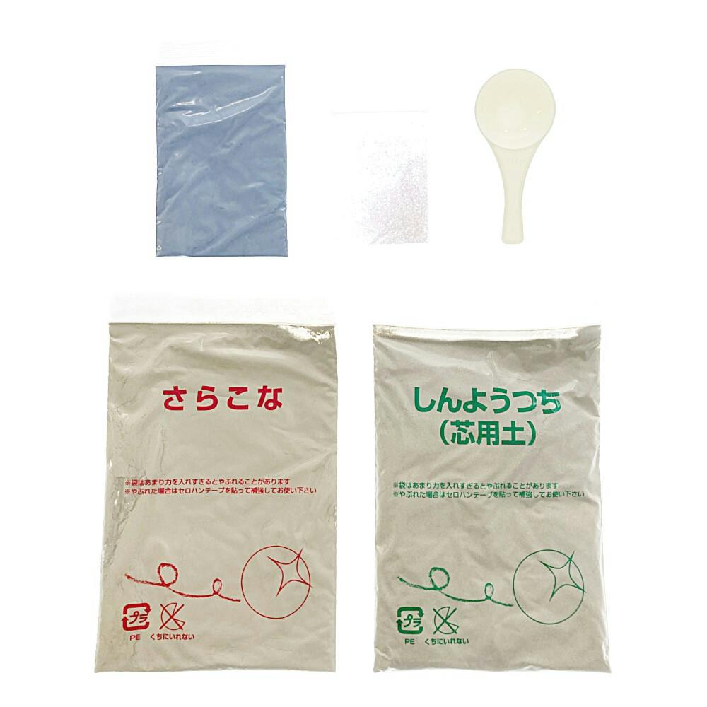 ●芯用土(約200g)●さらこな(約40g)●青の色こな(約10g)●ラメ(約0.3g)●計量スプーン(約10cc)●台紙(中面につくりかたの説明があります)