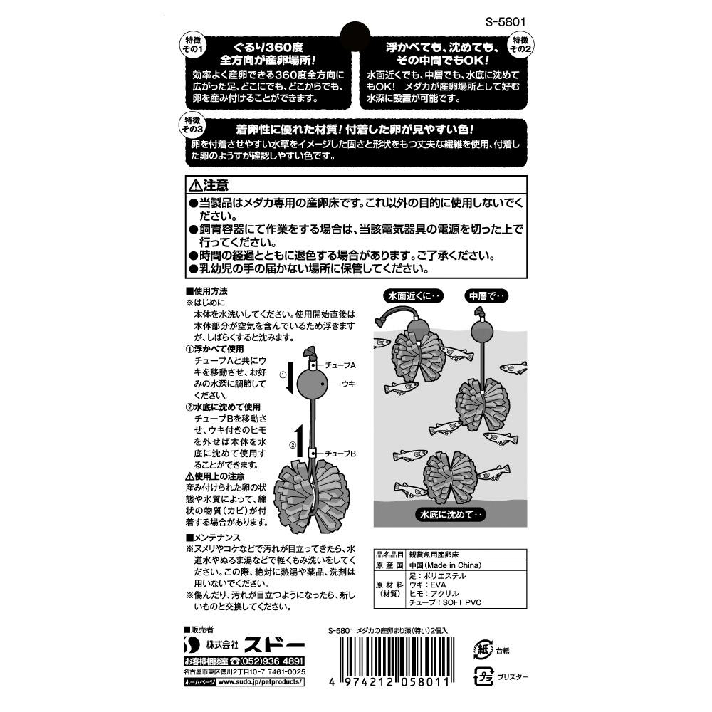 当製品はメダカ専用の産卵床です。これ以外の目的に使用しないでください。時間の経過とともに退色する場合があります。乳幼児の手の届かない場所に保管ください。