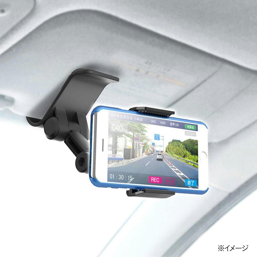 ●純正サンバイザーにクリップで取付けることが出来るスマートフォンホルダーです。。●ドライブレコーダーアプリなどのご使用に適した、高い位置に取付けが可能です。●プッシュ式の「ロックボタン」で素早く前後の角度が調節できます。