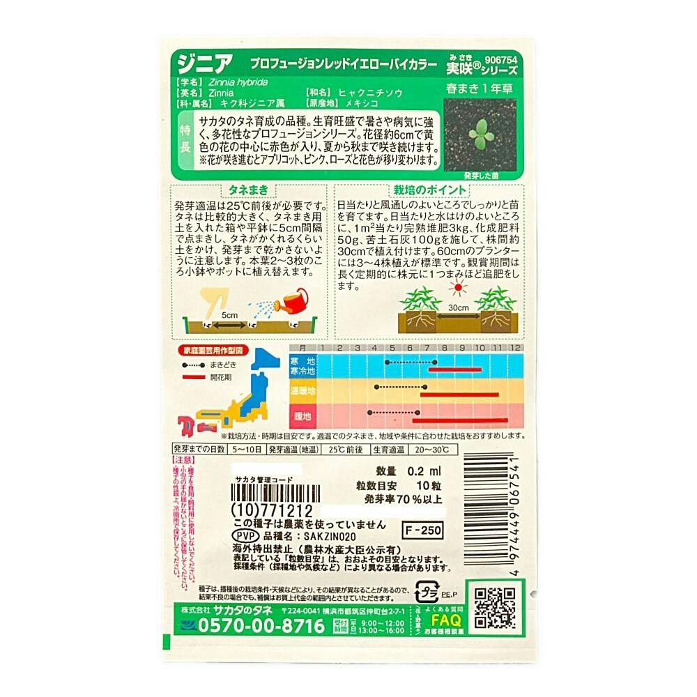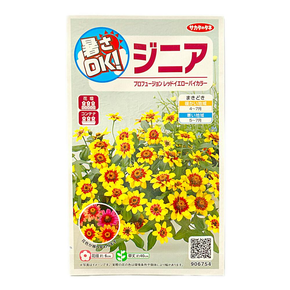 サカタのタネ育成の品種。生育旺盛で暑さや病気に強く、多花性なプロフュージョンシリーズ。花径約6cmで黄色の花の中心に赤色が入り、夏から秋まで咲き続けます。※花が咲き進むとアプリコット、ピンク、ローズと花色が移り変わります。