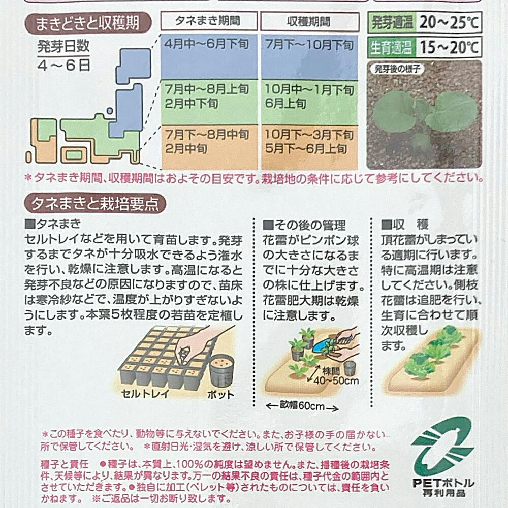●花蕾の形状・しまりのよい中早生種。●頂花蕾収穫後、側枝花蕾が次々とれる多収穫。●秋でも春でも作りやすい。●発芽適温:20~25℃●生育適温:15~20℃