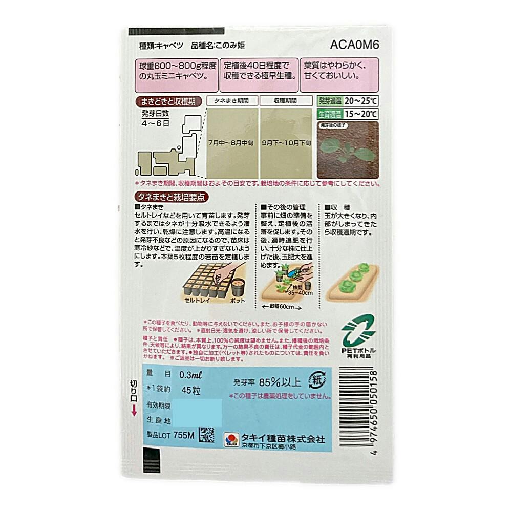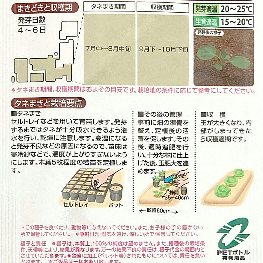 ●球重600~800g程度の丸玉ミニキャベツ。●定植後40日程度で収穫できる極早生種。●葉質はやわらかく、あまくておいしい。●発芽適温:20~25℃●生育適温:15~20℃