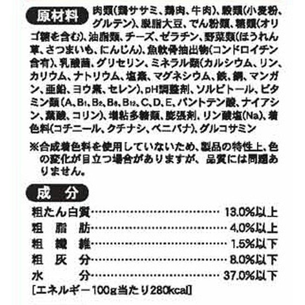 肉類(鶏ササミ、鶏肉、牛肉)、穀類(小麦粉、グルテン)、脱脂大豆、でん粉類、糖類(オリゴ糖を含む)、油脂類、チーズ、ゼラチン、野菜類(ほうれん草、さつまいも、にんじん)、魚軟骨抽出物(コンドロイチン含有)、乳酸菌、グリセリン、その他