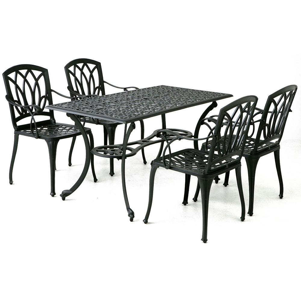 重量感がある上品なデザインのテーブルセット。落ち着きのあるブラックの色合いが、お庭をラグジュアリーな雰囲気に。テーブルは幅140cmで、広々使える大きめサイズ。チェアーは奥行き62cmでゆったり座れます。軽くて、サビに強いアルミ製。