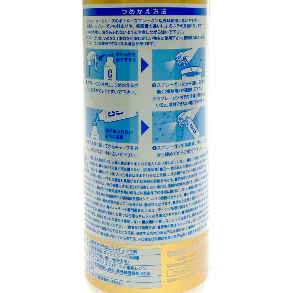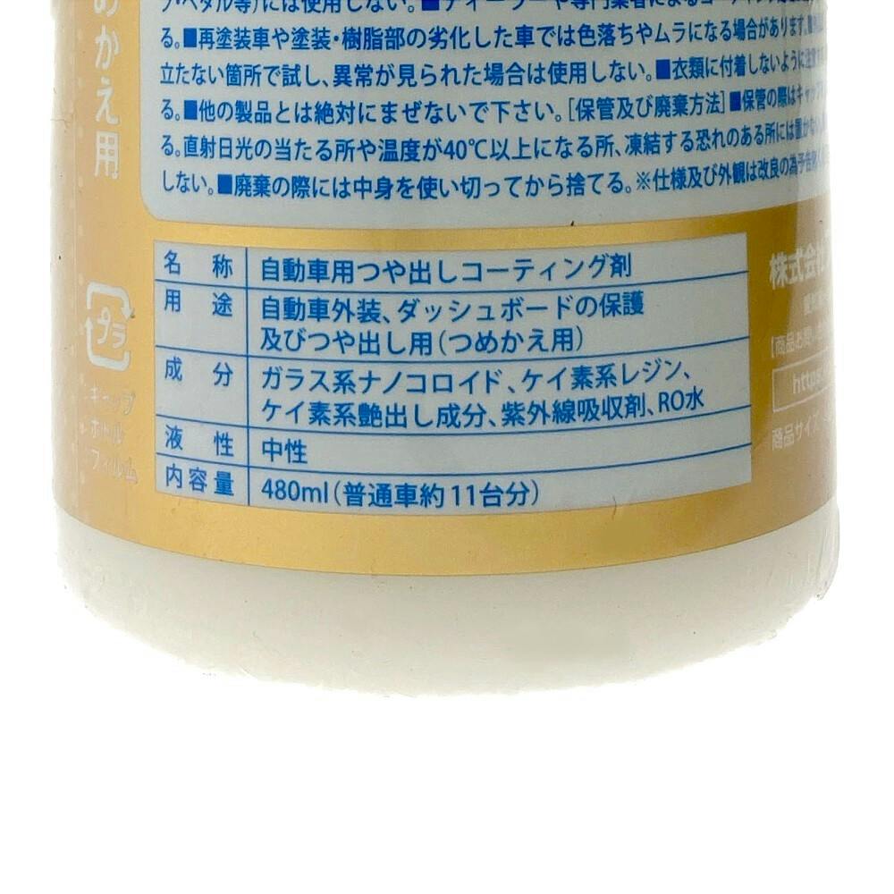 簡単作業でかがやきボディーを実現するガラス系コーティング剤「CCウォーター ゴールド」のつめかえ用です。 たっぷり使える、大容量サイズの480ml。普通車約11台分使用できます。 また、パッケージを簡素化した、エコロジー商品です。