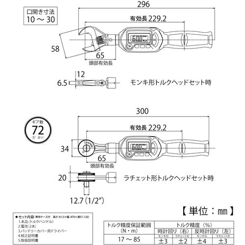 モンキヘッド装着時:296mm・ラチェットヘッド装着時:300mm