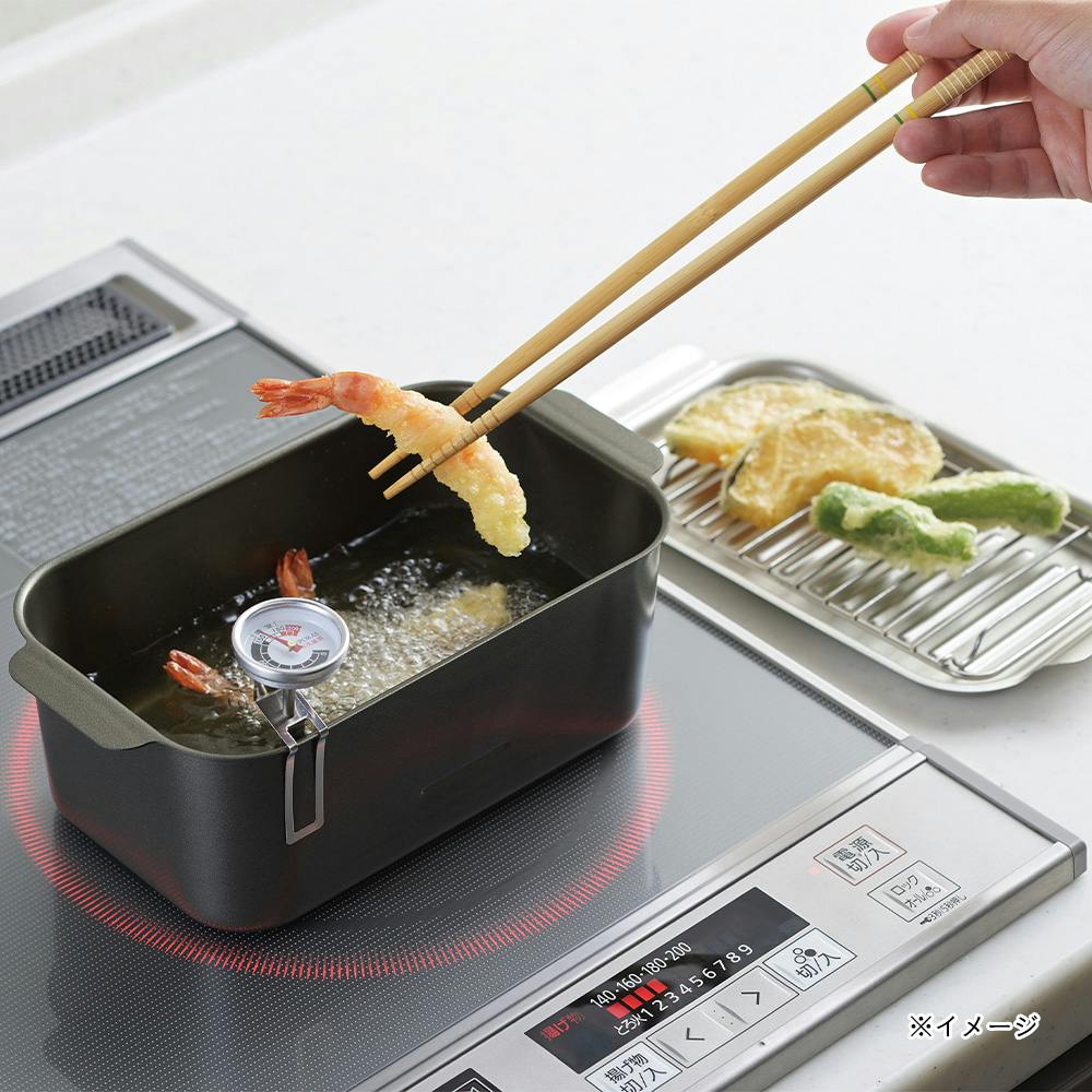 角型蓋付き天ぷら鍋 アミ・温度計付
