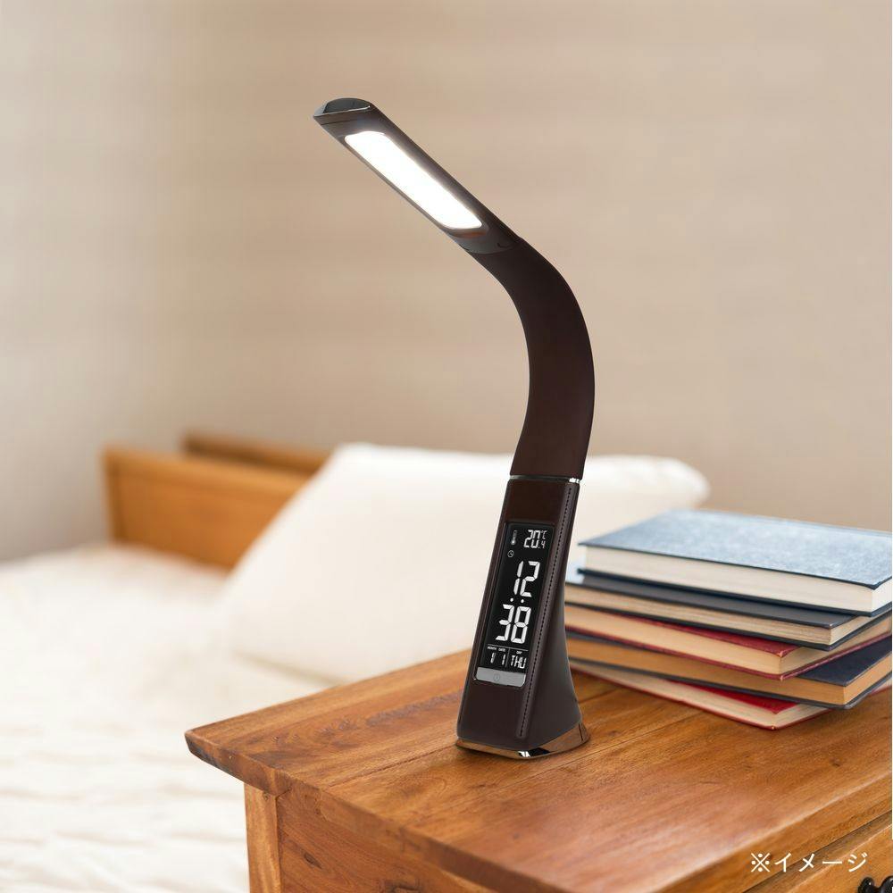 ●温度・時刻・カレンダーを表示する液晶付き ●アラーム・スヌーズ機能付き 目覚まし時計としても使える ●インテリア性のあるレザー調デザイン ●手元・枕元を明るいながらもやさしく照らす ●フリッカー低減機能を搭載した目にやさしいスタンドライト
