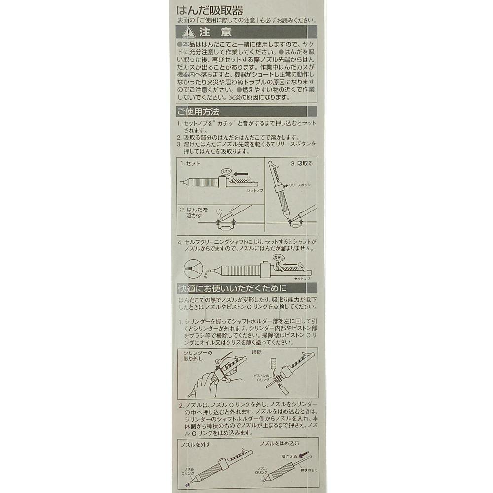 ●本品ははんだこてと一緒に使用しますので、ヤケドに充分注意して作業してください。●はんだを吸い取った後、再びセットする際ノズル先端からはんだカスが出ることがあります。●燃えやすい物の近くで作業しないでください。火災の原因になります。等