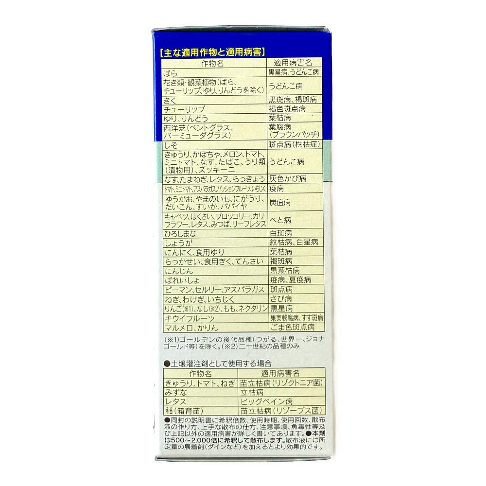 草花、野菜、果樹など様々な植物で、かび類(糸状菌)によって起こり、特にもち病や炭そ病、斑点病など葉が変色するタイプの広範囲の病気に効果がある優れた園芸用の総合殺菌剤です。