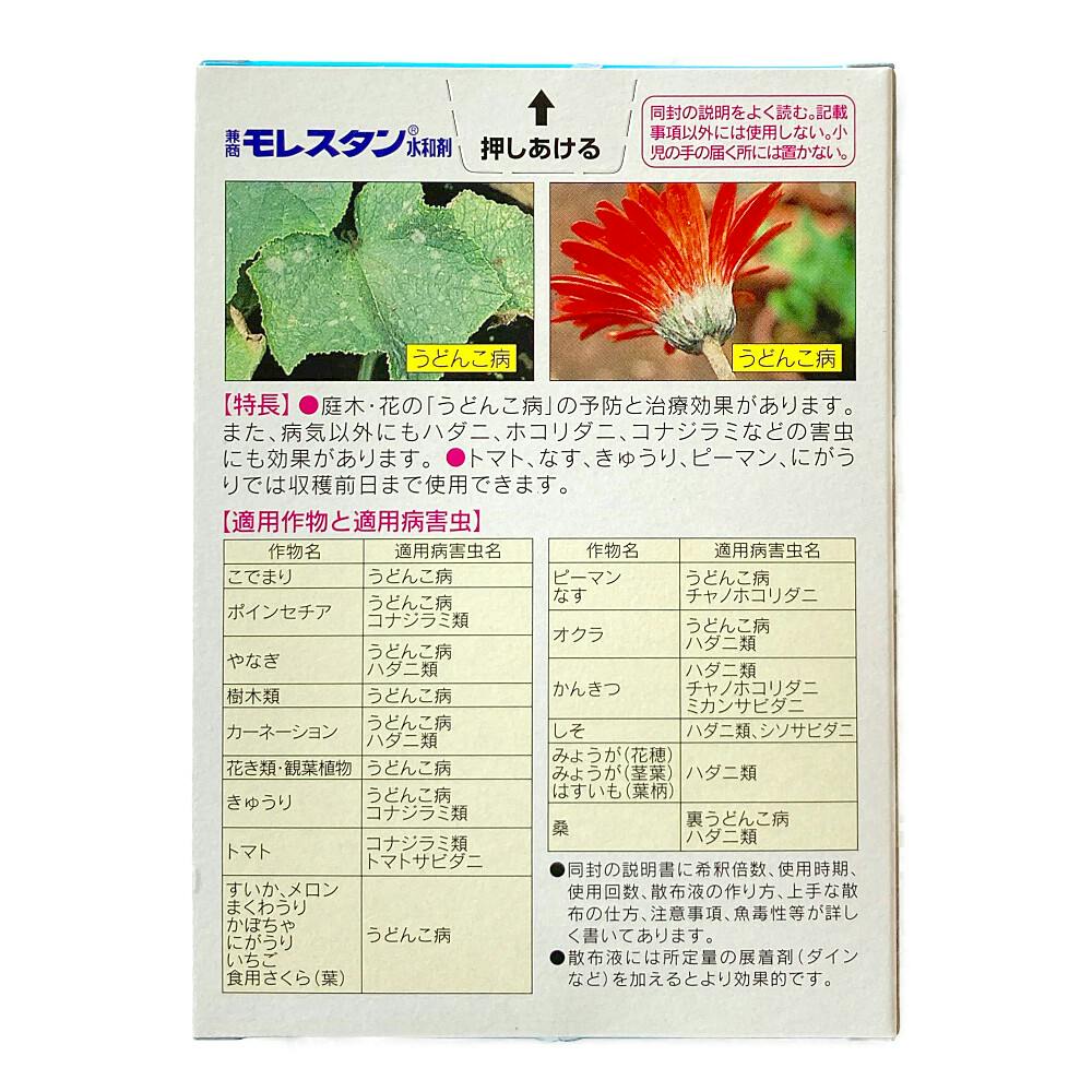 庭木・花のうどんこ病の予防と治療効果があります。また、病気以外でもハダニ、ホコリダニ、コナジラミなどの害虫に効果があります。