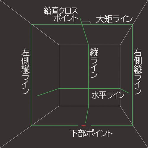 縦ライン(正面、右、左)、水平ライン、大矩ライン、ポイント(鉛直クロス、下部)