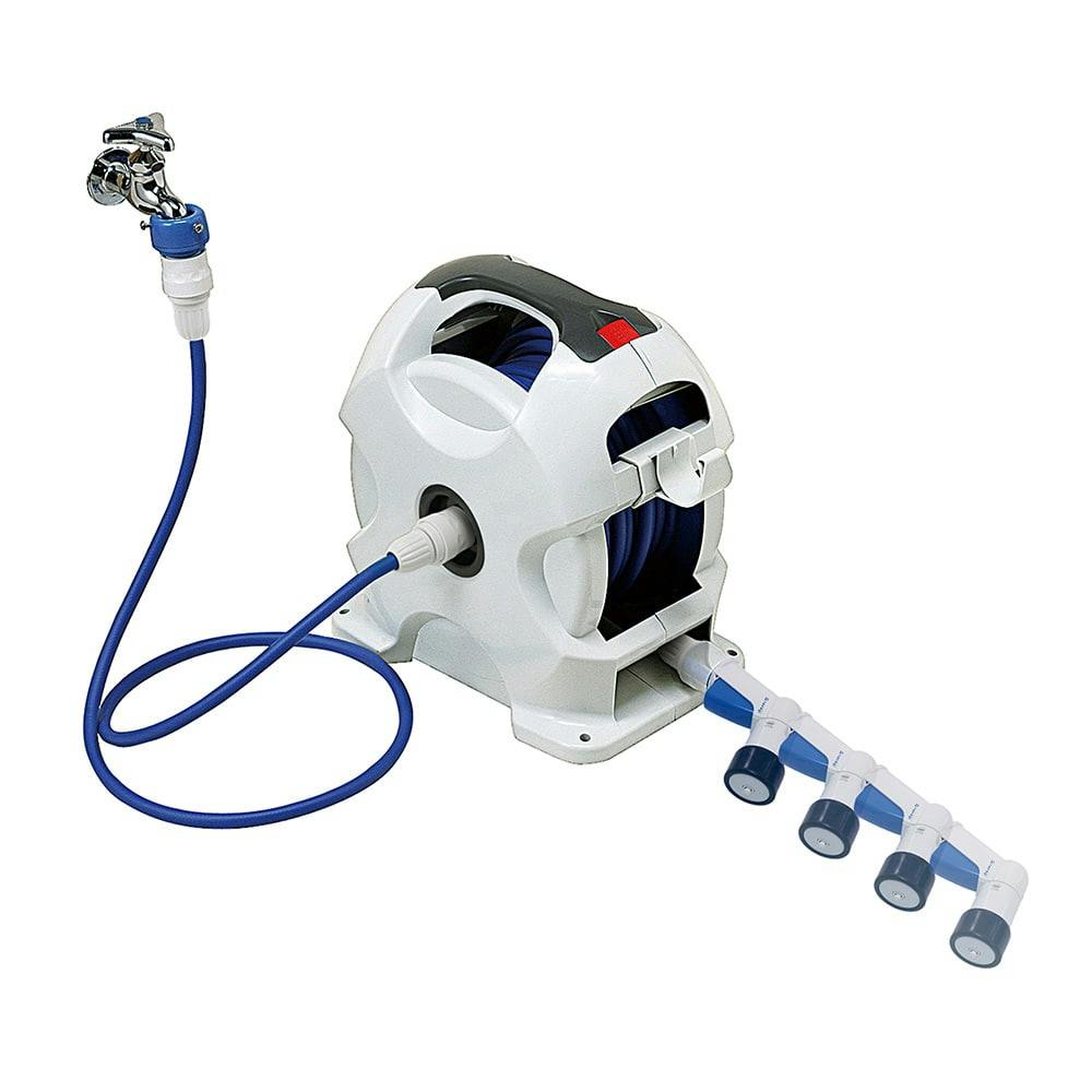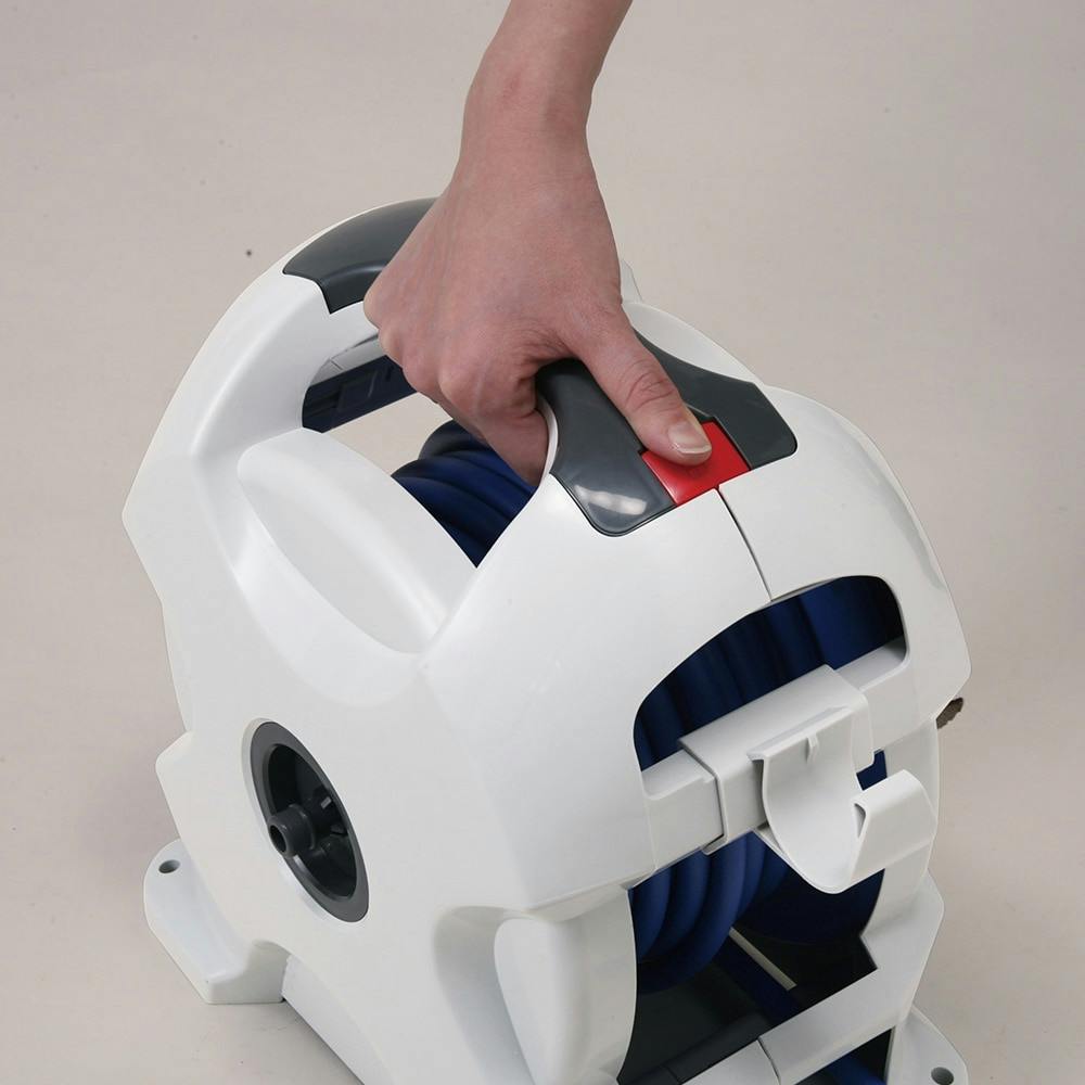 ●本体上部の赤いボタンを押すと自動で巻き取り、離すとドラムが固定されて巻き取りが止まります。●ラチェット機構ですので、ホースを引き出す際、5~10cm間隔でホースの長さが固定できます。