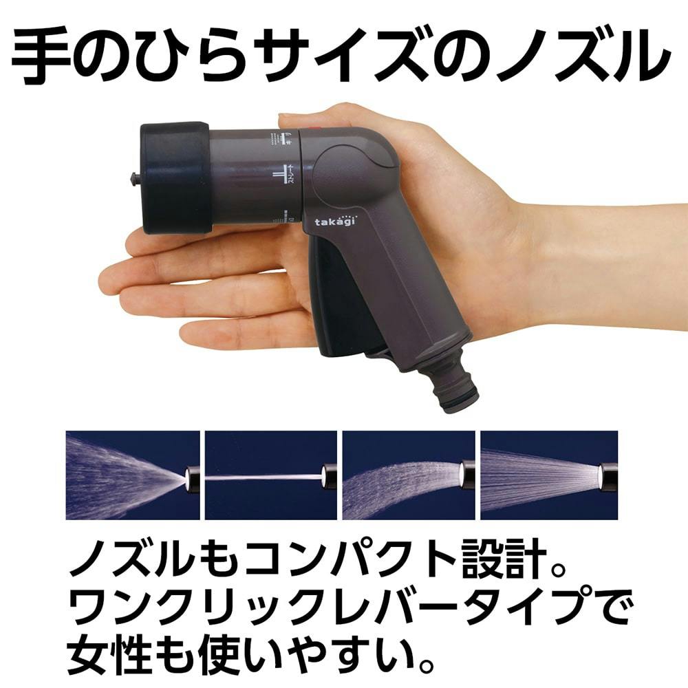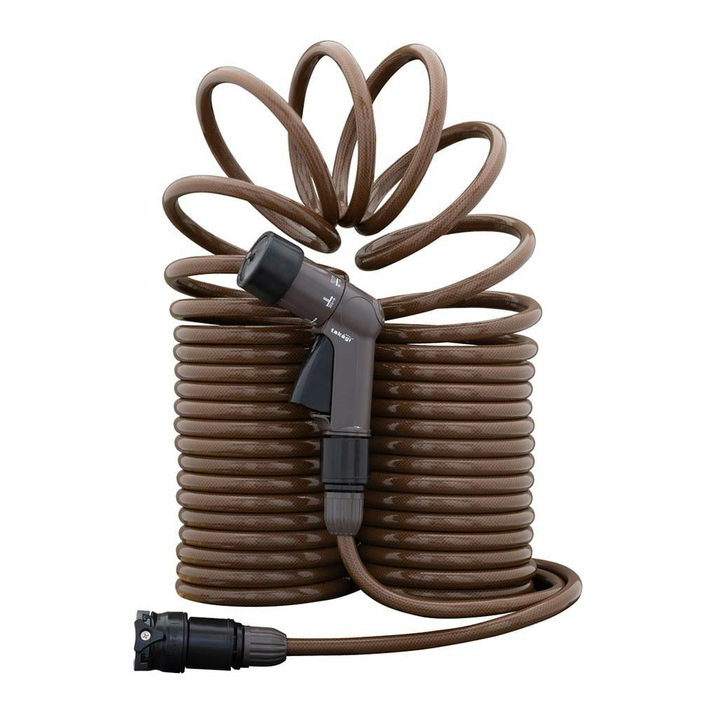 ブラウンカラーのおしゃれなコイルホースです。二層耐圧の糸入りホースを使用しています。軽くて使いやすいコンパクトノズル付きなので植物の水やりはもちろん、洗車やお掃除にも最適。蛇口に差し込んで締めるだけのかんたん取り付け蛇口ニップルが付いています。