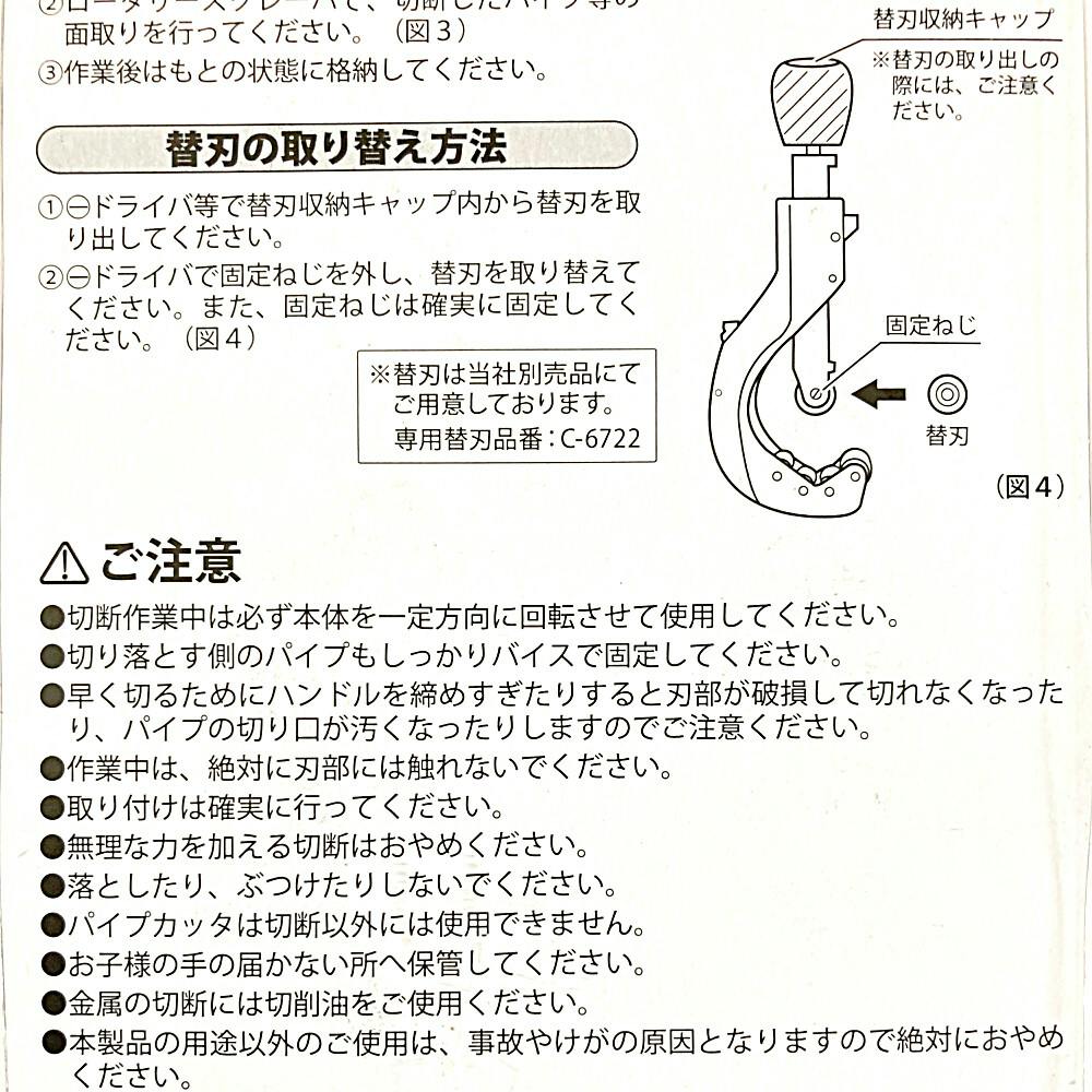 ●切断作業中は必ず本体を一定方向に回転させて使用してください。●切り落とす側のパイプもしっかりバイスで固定してください。●早く切るためにハンドルを締めすぎたりすると刃部が破損して切れなくなったり、パイプの切り口が汚くなったりしますのでご注意ください。等