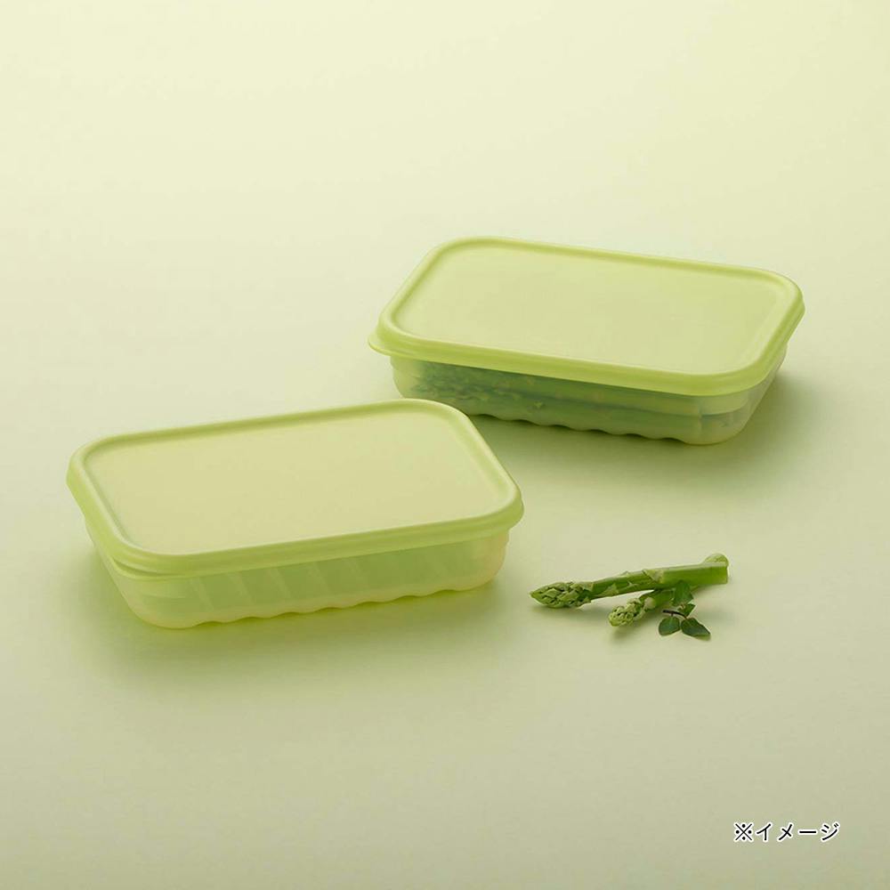 容器のゼオライト成分が食材のエチレンガスを吸着し、鮮度を長持ち。抗菌加工。底面の波型仕様でシャキシャキ食感をキープ。