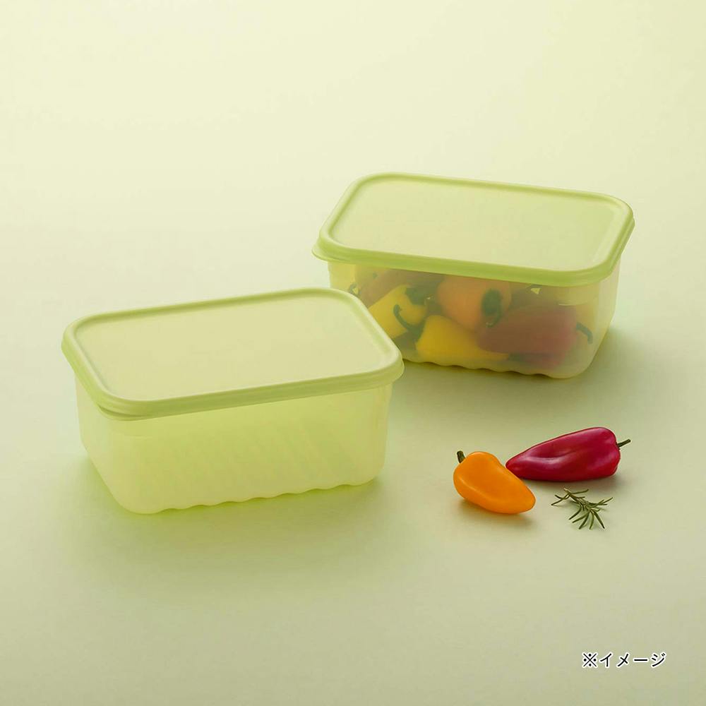 容器のゼオライト成分が食材のエチレンガスを吸着し、鮮度を長持ち。抗菌加工。底面の波型仕様でシャキシャキ食感をキープ。