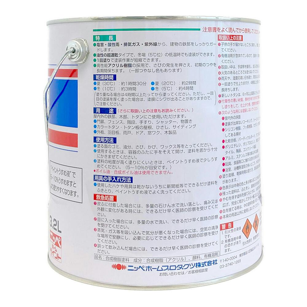 ●塩害・酸性雨・排気ガス・紫外線から、建物の鉄部をしっかりガードします。●油性の超速乾タイプで、冬場の低温時でも塗装ができます。●1回塗りで塗装作業が短縮できます。●高性能アクリル樹脂の採用で、さびの発生を押さえ、初期のつやを長期間保ちます。