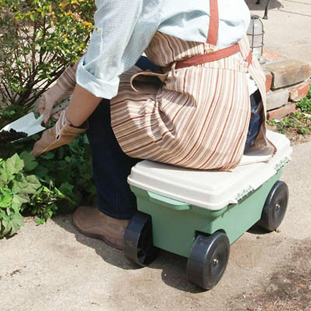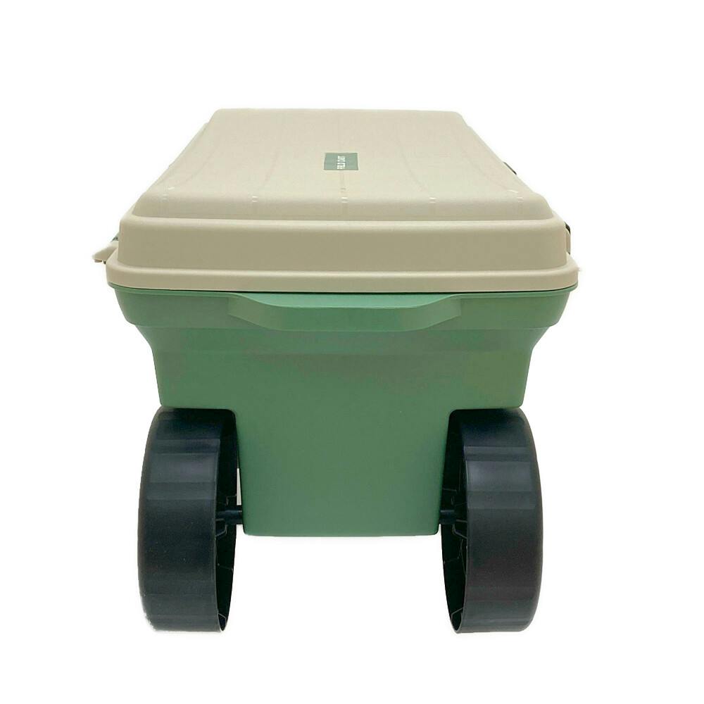 ●フタ式収納のプラタイヤ付き、腰掛けカート ●小物が収納可能 ●腰かけでラクラク除草作業