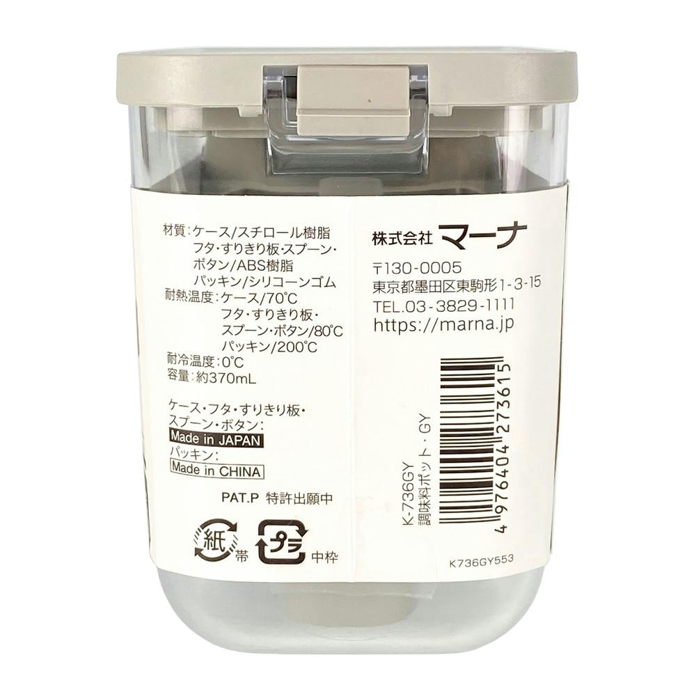 ●パッキン付きで湿気を防ぎ、中の調味料が固まりにくい調味料入れです。●手元のボタンでワンタッチオープン。●スプーンは、すりきり板に立て掛けると、調味料に埋もれません。●パッキンとすり切り板が取り外せるので衛生的にお使いいただけます。