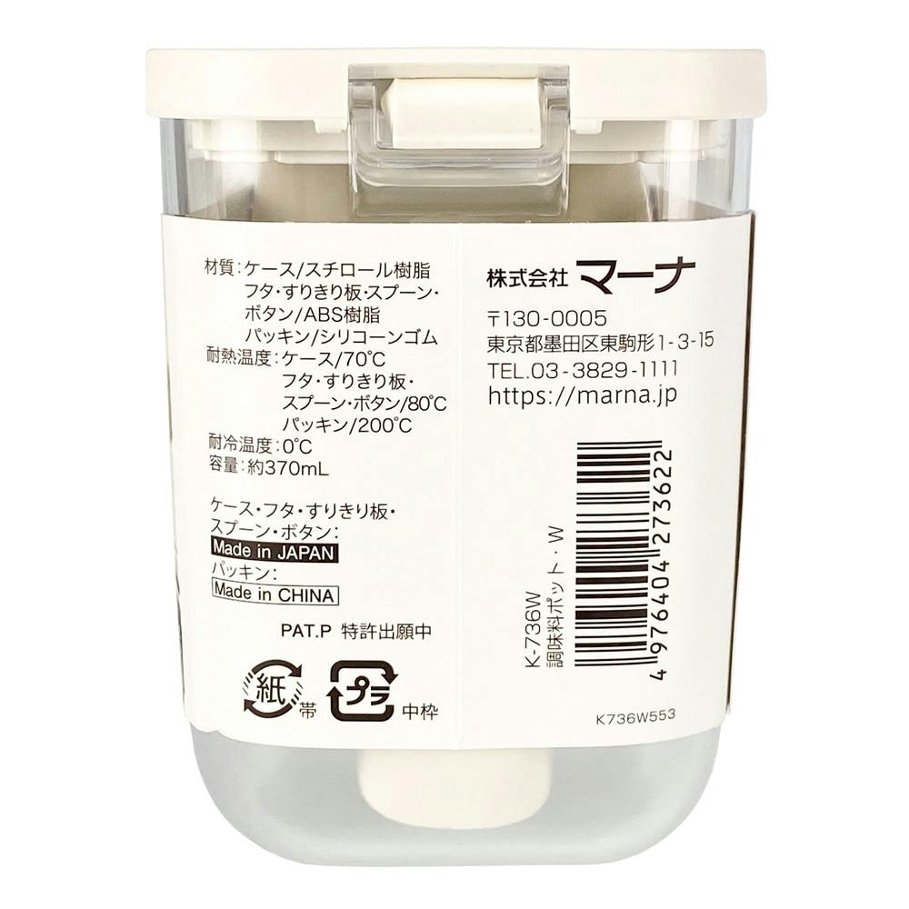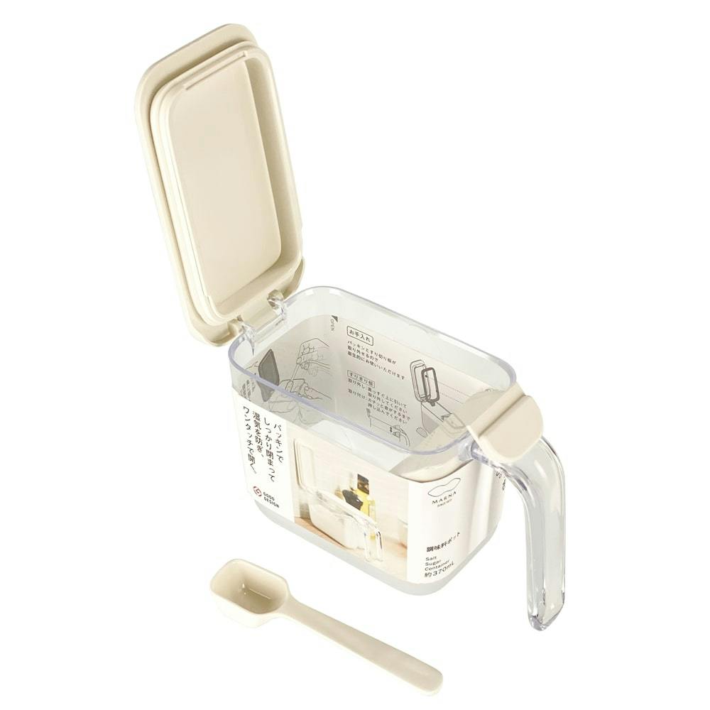 ●パッキン付きで湿気を防ぎ、中の調味料が固まりにくい調味料入れです。●手元のボタンでワンタッチオープン。●スプーンは、すりきり板に立て掛けると、調味料に埋もれません。●パッキンとすり切り板が取り外せるので衛生的にお使いいただけます。
