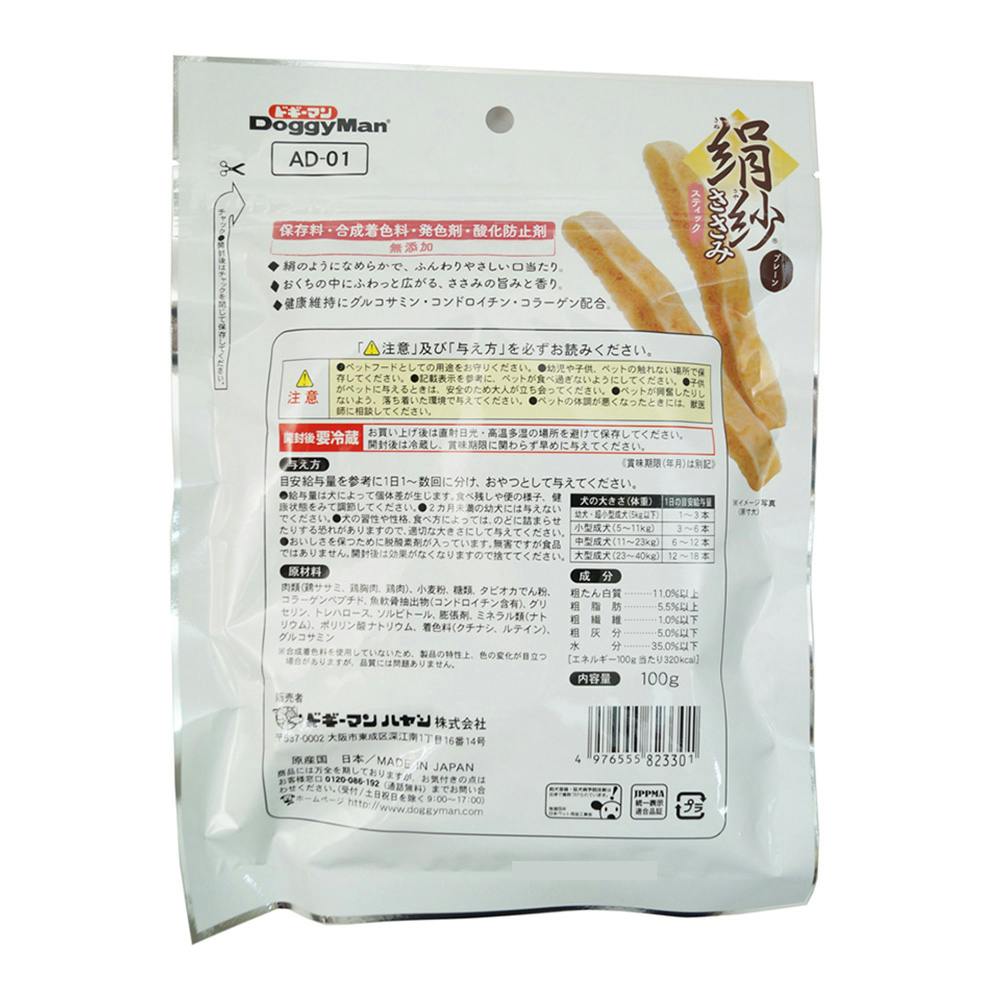 ササミたっぷり、至福の味わい。ふんわりやわらか新食感のごほうびおやつ。絹のような極上のおいしさをワンちゃんにお届けします。保存料、合成着色料、発色剤、酸化防止剤不使用。