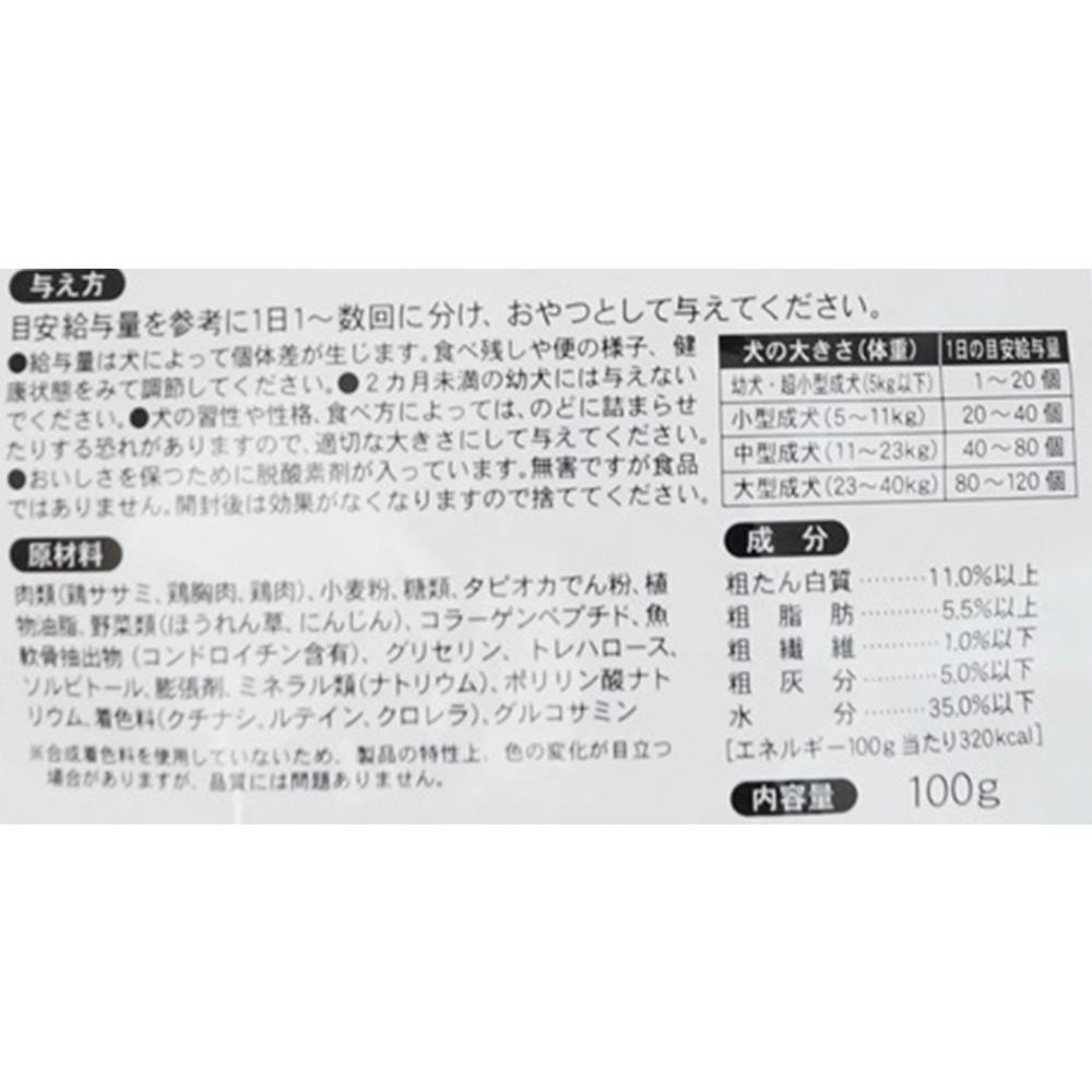 肉類(鶏ささみ、鶏胸肉、鶏肉)、小麦粉、糖類、タピオカでん粉、植物油脂、野菜類(ほうれん草、にんじん)、コラーゲンペプチド、魚軟骨抽出物(コンドロイチン含有)、グリセリン、トレハロース、ソルビトール、膨張剤、ミネラル類(ナトリウム)、ポリリン酸ナトリウム、着色料 他