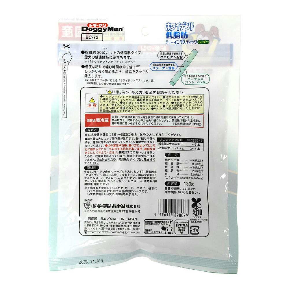 適度な粘りでしっかり長く噛める、スティック形状の犬用おやつです。 当社「ホワイデントスティック」と比較して脂質約80%カットの低脂肪タイプです。 お口が爽やかに香るハーブ入りです。 歯磨き習慣を提案する「ホワイデント」シリーズです。