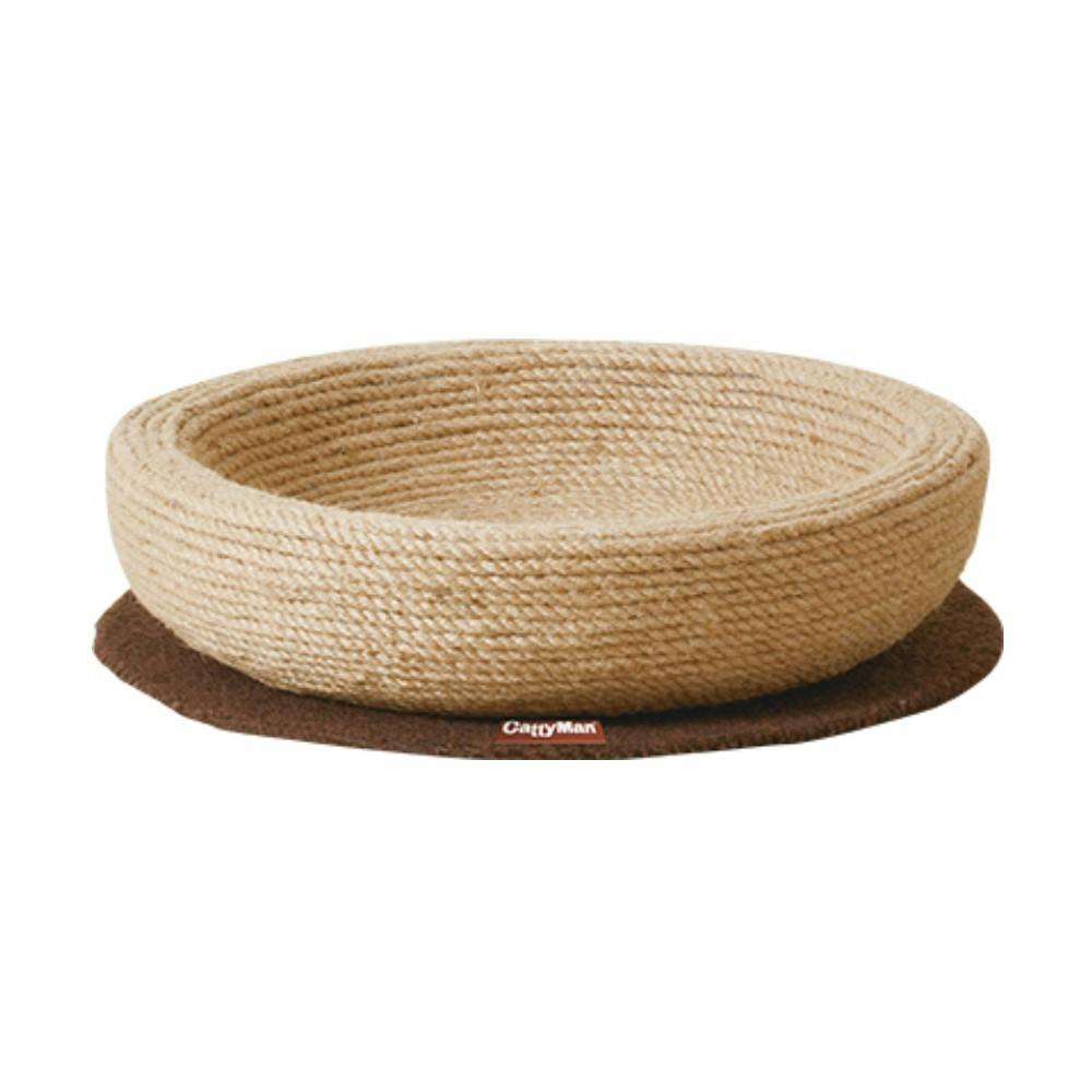 麻縄の持つナチュラルな風合いの素材で出来き、愛猫の背中にフィットする浅目の鍋型設計で爪磨きも出来るベッド。