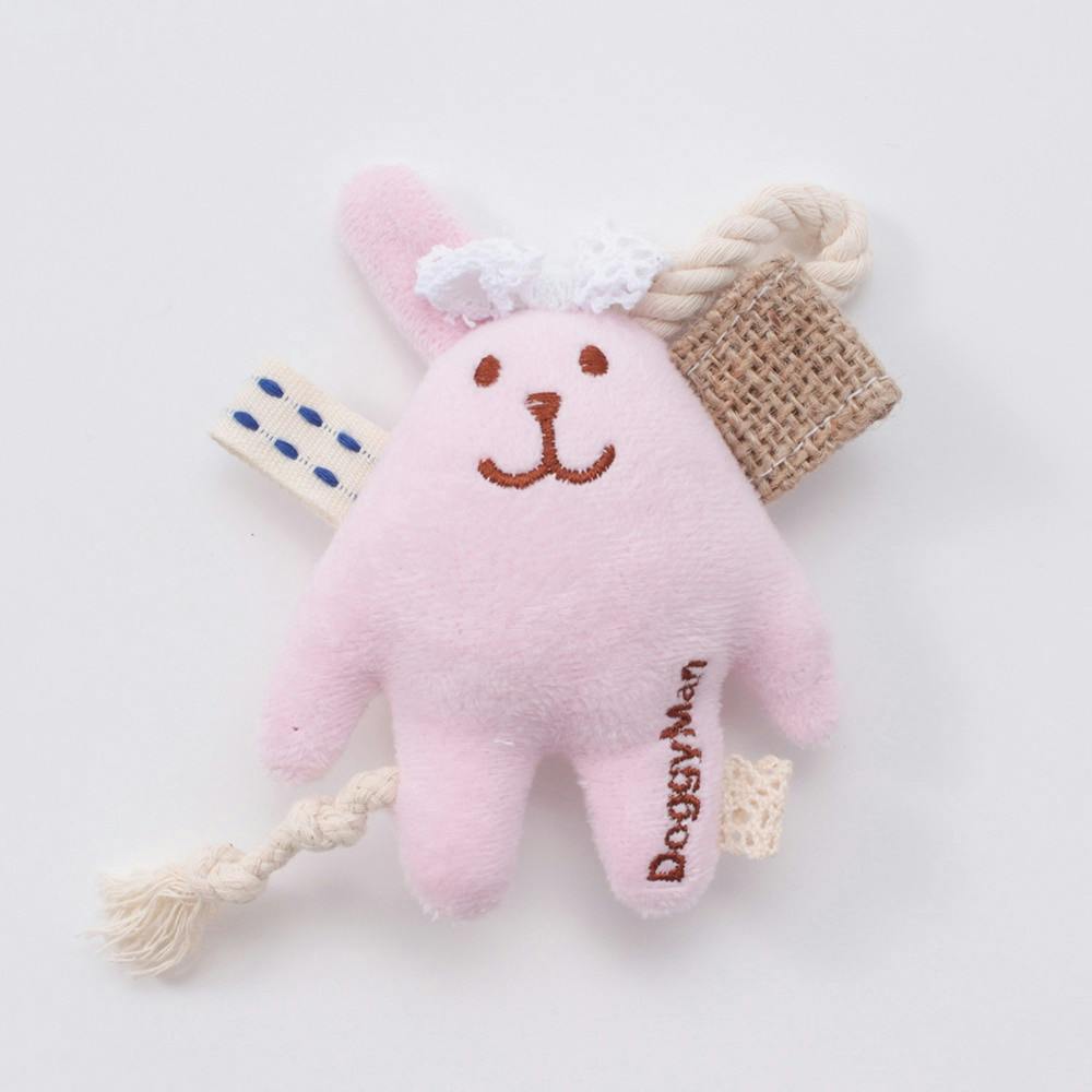 ぬいぐるみにワンちゃんが大好きな噛める飾りをたくさんつけたコミュニケーション玩具。噛み心地の異なる素材をたくさん飾りつけました。飾りには天然素材のコットンと麻を使用し、ガジガジ噛んで遊べますので、ワンちゃんの心をガッチリとつかみます!