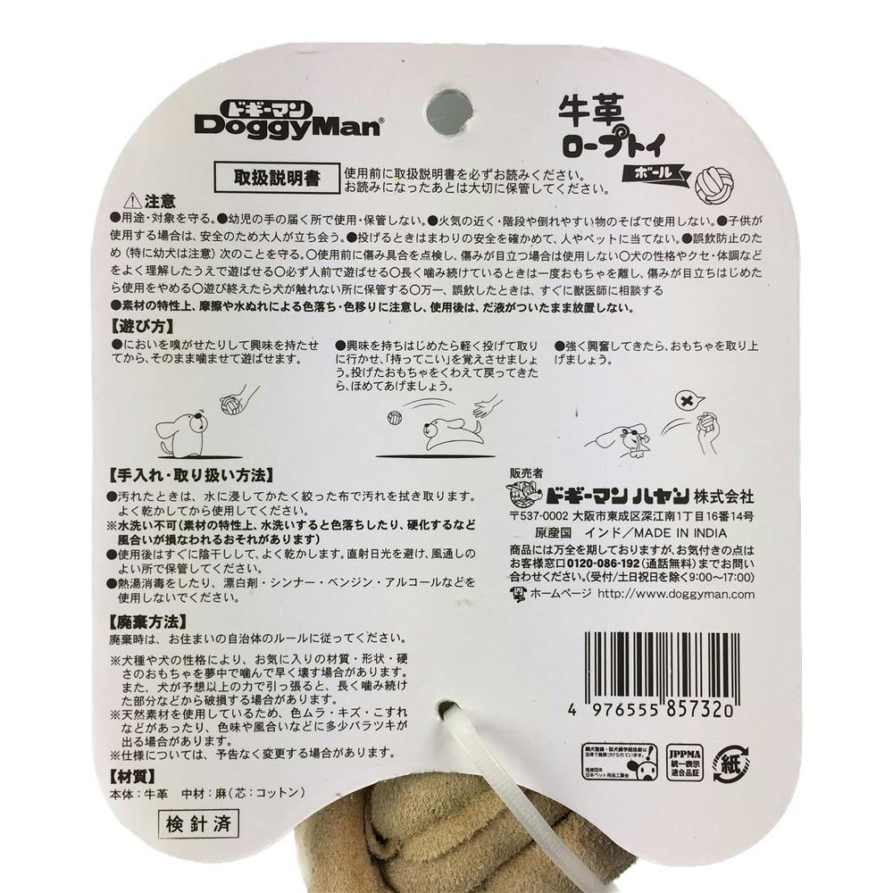 牛革の匂い=獲物の匂いと、化繊とは異なる弾力のある噛み心地が犬の本能を刺激!興味を引きやすい玩具なので、遊びながらのしつけにも適しています。ヤシ縄を牛革で包み込んだロープ状でハードな噛みごたえが大好きなわんちゃんにオススメのアイテム。転がして遊べるボール型。