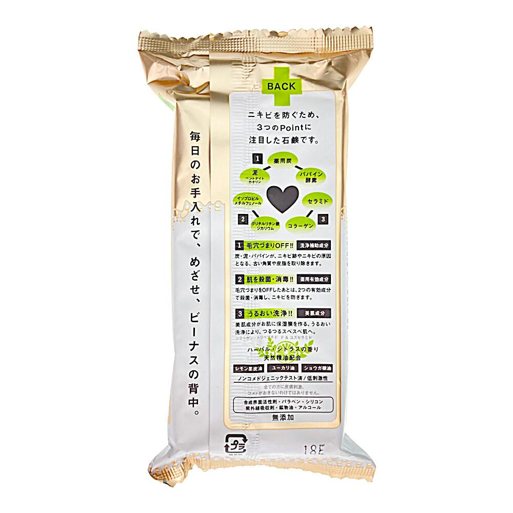 【有効成分】イソプロピルメチルフェノール、グリチルリチン酸ジカリウム【その他の成分】石けん用素地、ベントナイト、カオリン、デキストリン、クエン酸、濃グリセリン、薬用炭、グリセリン、パパイン、パルミチン酸アスコルビル、1,3-ブチレングリコール、精製水、など