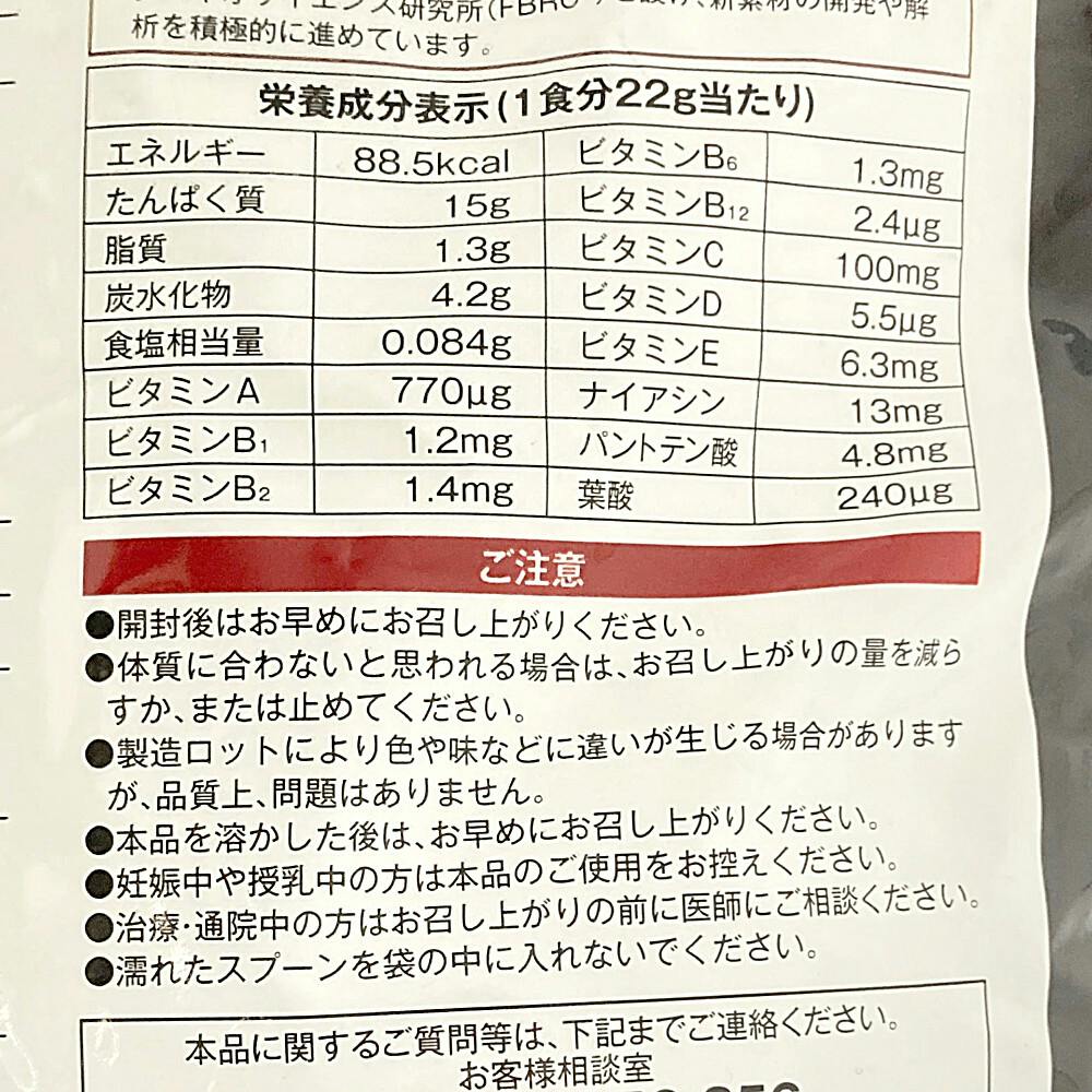 1食分22g当たり/エネルギー:88.5kcal、たんぱく質:15g、脂質:1.36g、炭水化物:4.2g、食塩相当量:0.084g、ビタミンA:770μg、ビタミンB1:1.2mg、ビタミンB2:1.4mg、ビタミンB6:1.3mg、ビタミンB12:2.4μg、ビタミンC:100mg、ビタミンD:5.5μg、ビタミンE:6.3mg、等