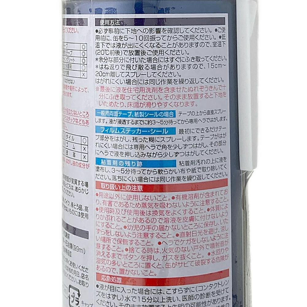 (1)はがす粘着剤やテープの回りに液がかからないようにマスキングをする。(2)缶を軽く振り、粘着剤やテープにスプレーする。(3)約5分放置した後付属のヘラではがす。(4)落ちにくい場合は数度同じ作業を繰り返す。