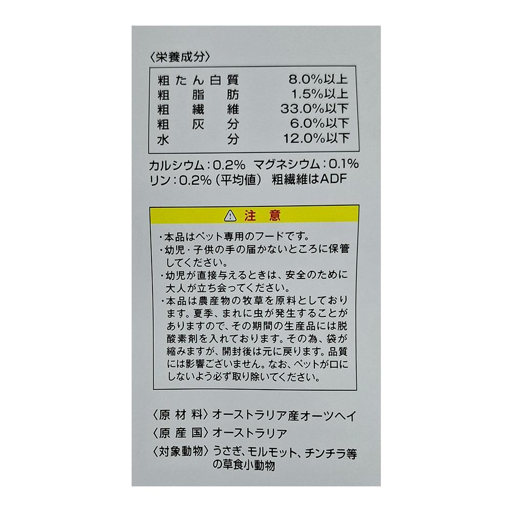 粗たん白質:8.0%以上、粗脂肪:0.5%以上、粗繊維:33.0%以下、粗灰分:6.0%以下、水分:12.0%以下、カルシウム:0.2%、マグネシウム:0.1%、リン:0.2%(平均値)