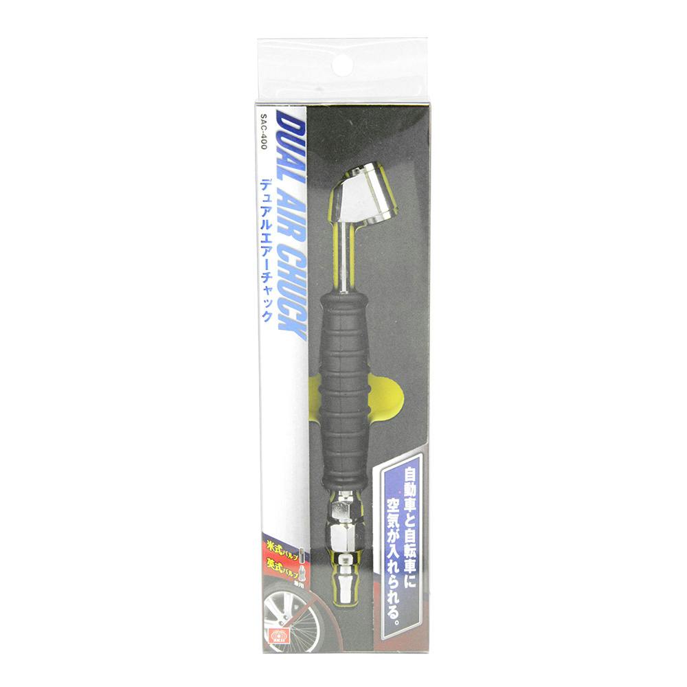 英式バルブ・米式バルブに適合するデュアルチャックで、自動車と自転車に空気が入れられます。
