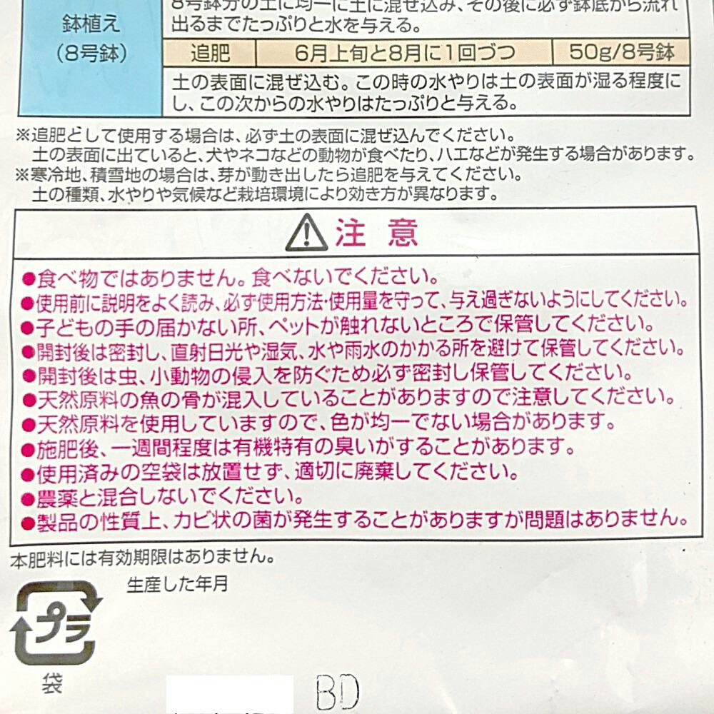 庭植え:元肥400g/株、追肥200g/株 、鉢植え(8号鉢):元肥65g/8号鉢、追肥50g/8号鉢