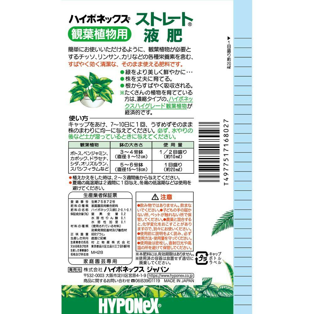 観葉植物にそのまま使える液体肥料! 簡単にお使いいただけるように、観葉植物が必要とする チッソ・リンサン・カリなどの各種栄養素を含む、 すばやく効く清潔な、そのまま使える肥料です。緑をより美しく、鮮やかに育てます。
