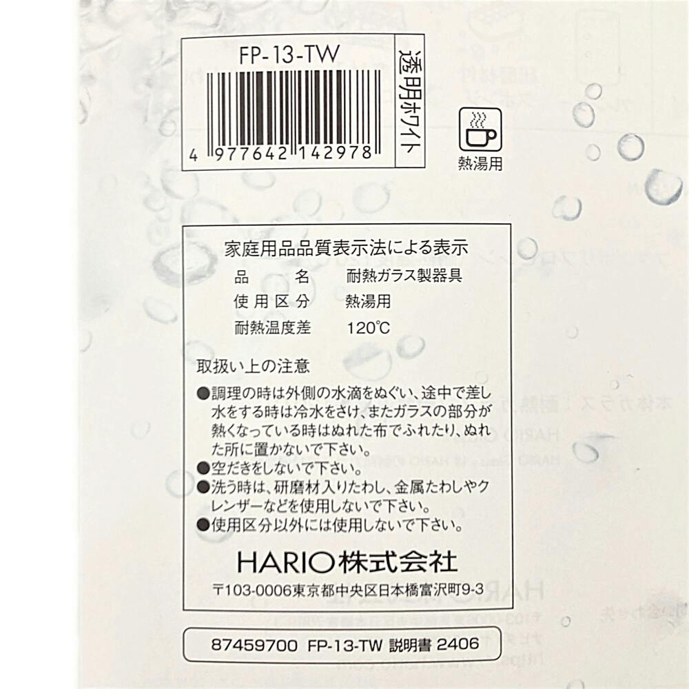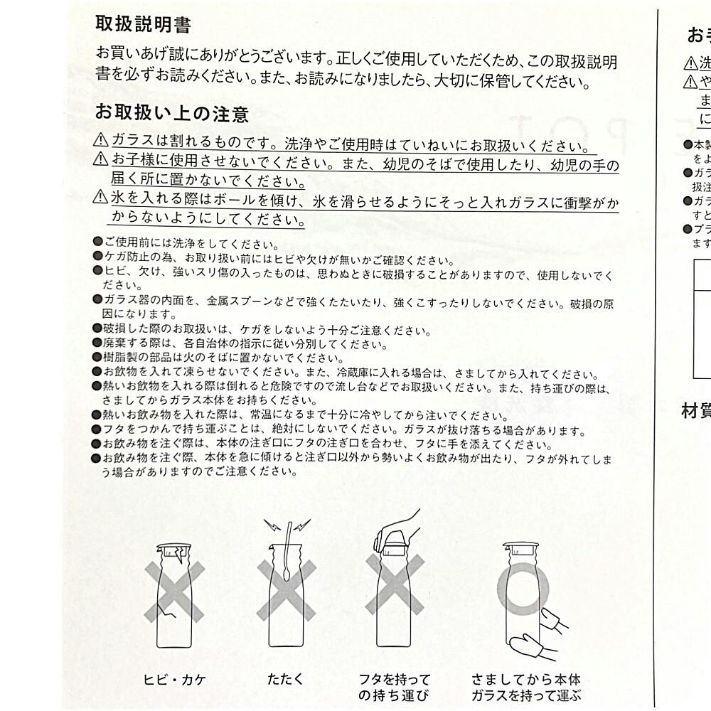 お取扱い上の注意/●ガラスは割れるものです。洗浄やご使用時はていねいにお取り扱いください。●お子様に使用させないでください。また、幼児のそばで使用したり、幼児の手の届く所に置かないでください。など