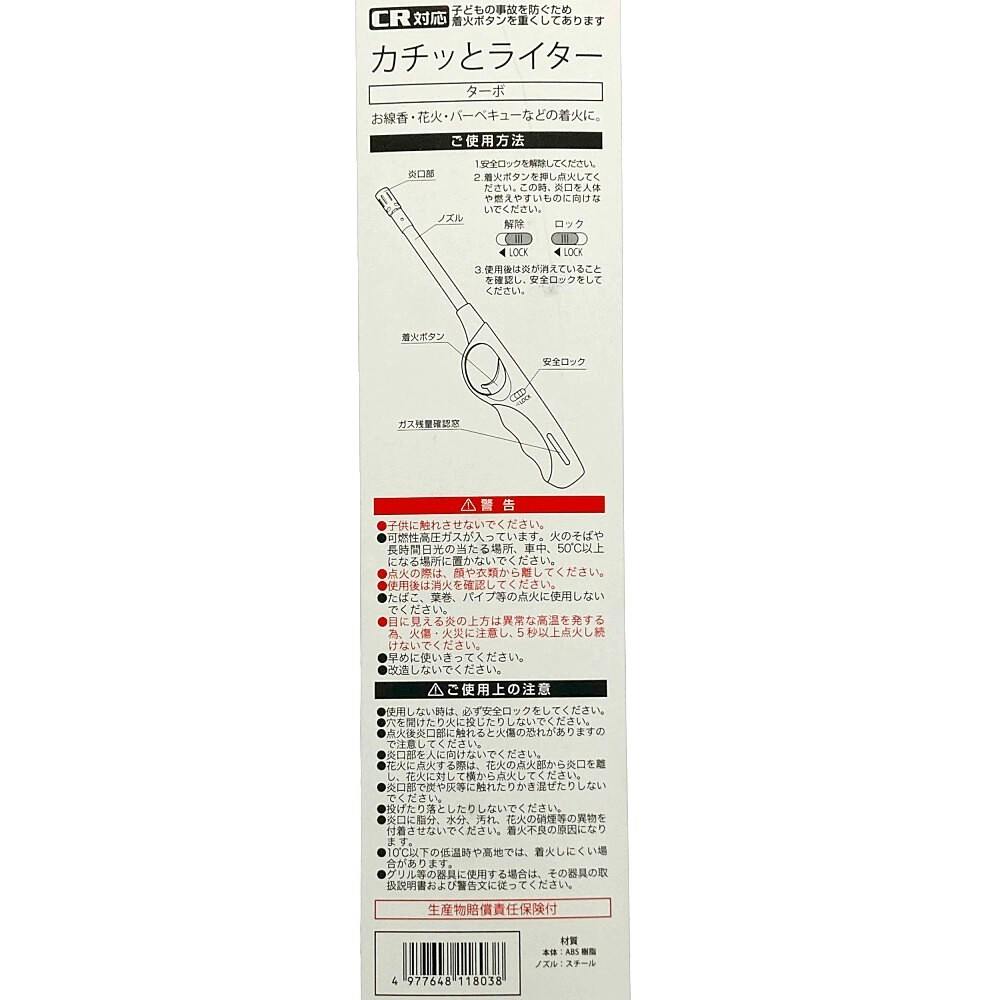 ●ガス残量窓付き●安全ロック付き●ターボ炎・CR対応(子供の事故を防ぐ為、着火ボタンを重くしてあります)●安定した炎長の無調整式の使いきりガスマッチ