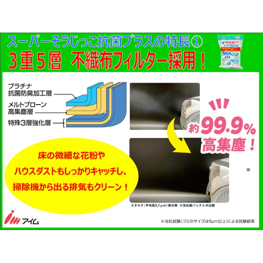 "そうじ機用取り替えパック。 3重5層不織布フィルター採用。床の微細な花粉や ハウスダストもしっかりキャッチ! ナノプラチナ抗菌剤が、細菌の繁殖を抑制し、イヤな臭いを抑える!"